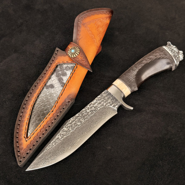 Масивен, много агресивен нож от дамаска стомана на NIKASHI, супер стомана, махагонова дръжка, TIGER тапа, кожена кания бланк и змия