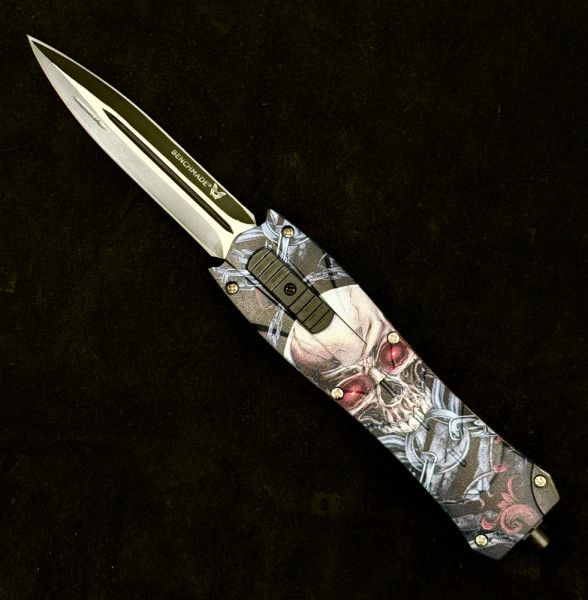 Красив, удобен и безотказен двуостър автоматичен нож MAIDEN SKULL, модел BENCHMADE. Здрава кама от стомана D2