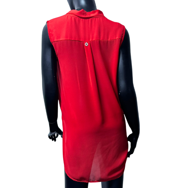 ✨ Дамска елегантна блуза в наситено червен цвят. Модел без ръкави, с ефектно прехлупване отпред и V-образно деколте, което придава изчистена и модерна линия. Гърбът е издължен и леко свободен, като е декориран с малък метален детайл със сърце. Изработена е от фина материя, която пада красиво и е подходяща както за ежедневни визии, така и за по-официални поводи