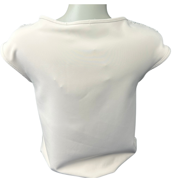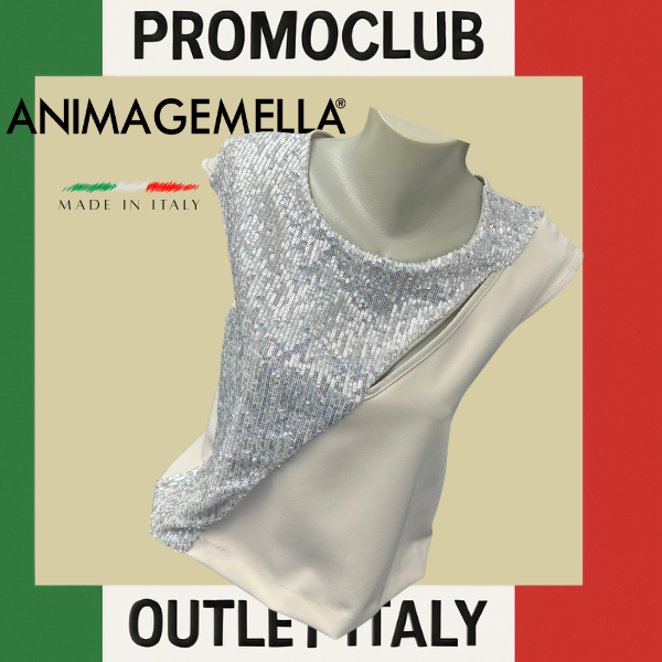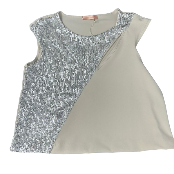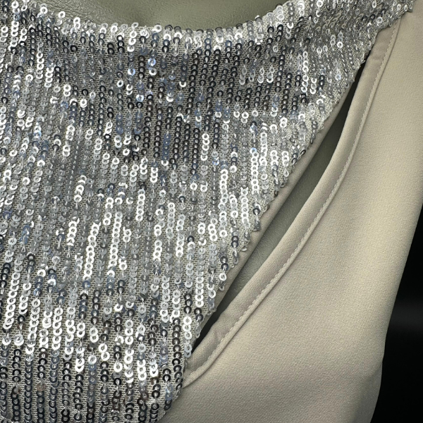 Елегантна блуза без ръкави в екрю, изработена от фина материя, която съчетава минимализъм и блясък. Моделът е акцентиран с асиметрична предна част – половината е покрита със сребристи пайети, които придават модерна визия и вечерно излъчване. Гладката изчистена задна част осигурява комфорт и стилен баланс. Подходяща е за комбинация с пола, панталон или дънки за ефектен парти или официален тоалет.