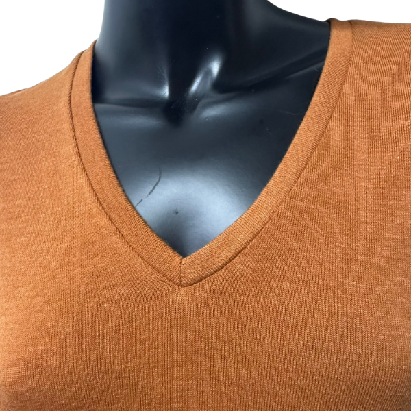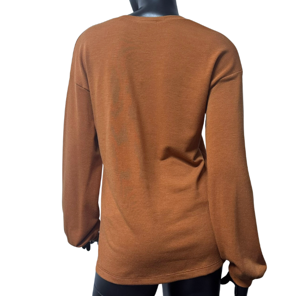 Моделът е в топъл керемиден цвят с V-образно деколте, което подчертава шията и придава женствена визия. Ръкавите са дълги и леко свободни в долната част за комфорт и стил.Универсален дизайн, подходящ както за ежедневието, така и за офис или вечерни комбинаци