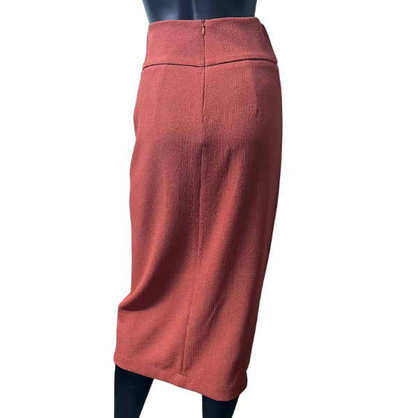 Полата YNOT? в наситен керемиденочервен цвят е елегантен модел с дължина под коляното и изчистена, права линия. Акцентът е стилната предна цепка, която добавя модерна визия и лекота при движение. Изработена е от висококачествен плат с лека текстура, който подчертава женствеността и придава комфорт. Талията е висока, с фин декоративен елемент – малък метален пръстен с цветна лента. Затваря се с дискретен цип отзад за перфектно прилягане. Универсална пола, подходяща както за офис стил, така и за вечерни излизания.