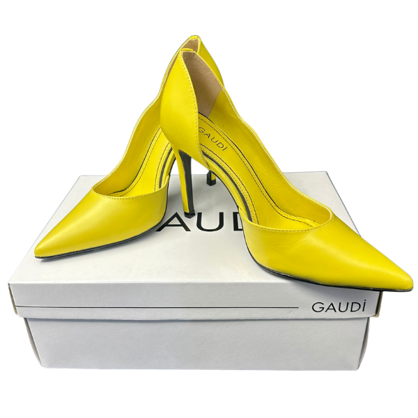 Жълти дамски обувки на висок ток GAUDI – елегантно и стилно допълнение към всяка визия.Моделът е с изчистен дизайн и заострен връх, те подчертават изяществото на крака. Токът е 9 см – идеален баланс между комфорт и изисканост, подходящ за официални събития, офис или специални поводи. Вътрешната част е мека и удобна, а външната излъчва смелост и модерност. Жълтият цвят придава свежест, настроение и индивидуалност, правейки обувките акцент във всяка комбинация.