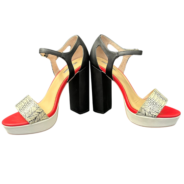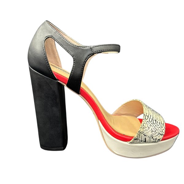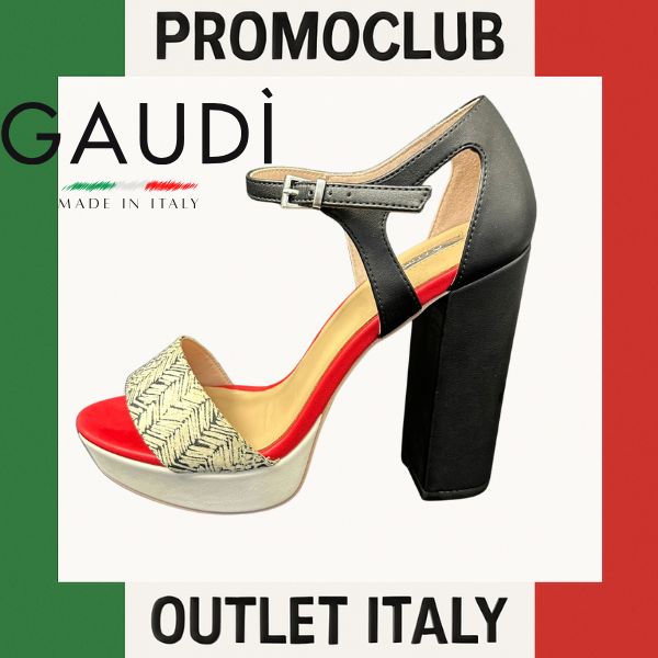 Сандали GAUDI с впечатляващ 12 см ток – смел избор за модерните жени, които искат да бъдат в центъра на вниманието. Моделът комбинира масивен ток с платформа за по-голям комфорт и стабилност. Дизайнът е съчетание от черна кожена каишка, червена основа и предна лента с релефен десен, който напомня животински мотив. Тези елементи придават екзотика и характер на обувките. Подходящи за вечерни излизания, парти визии или специални събития, те добавят височина, увереност и неповторим стил с италиански почерк.