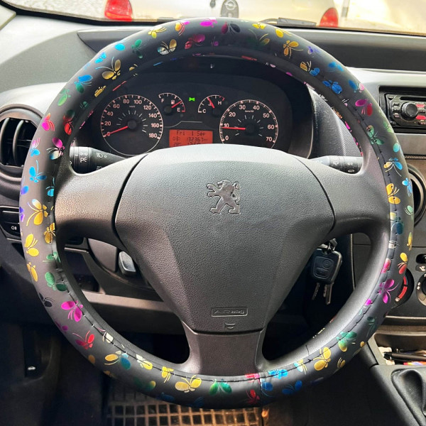 Красив, атрактивен и много елегантен калъф за волан в диско цветове ПЕПЕРУДИ, в най-масовият размер волан за 95% от леките автомобили
