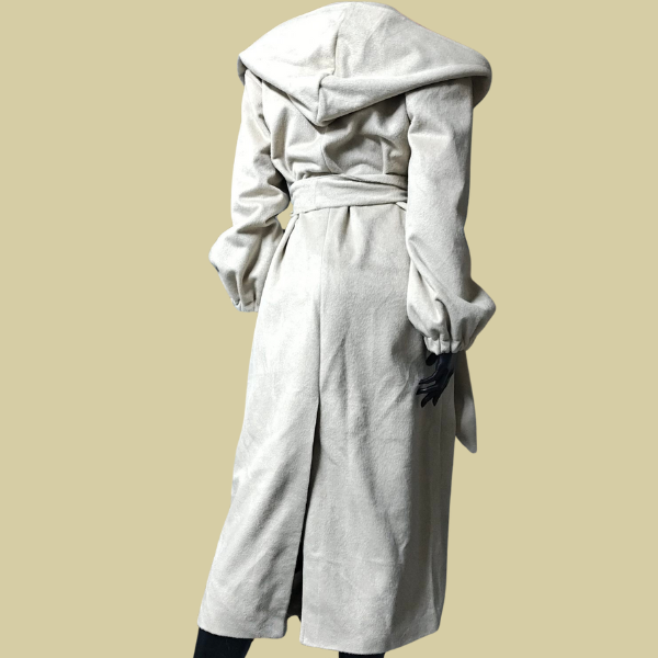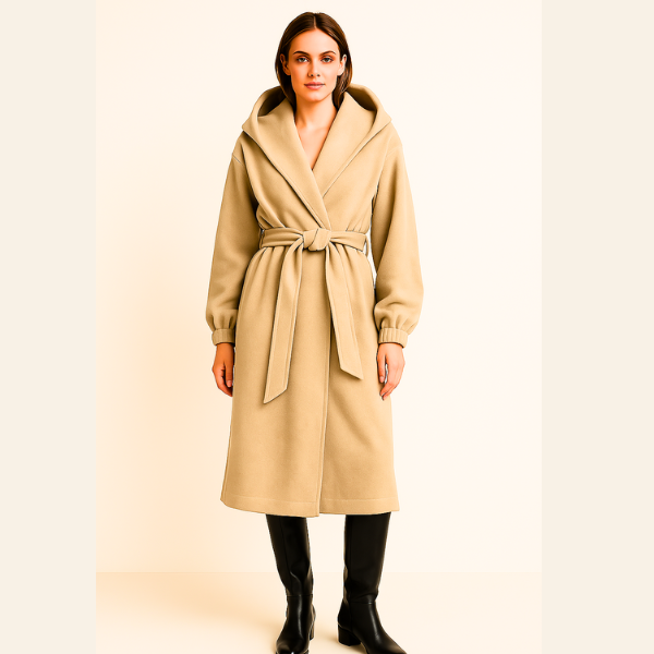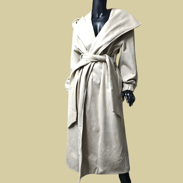 Кройката е свободна, но женствена, с колан на талията, който позволява да се регулира силуетът според предпочитанията – от по-разчупен до елегантно прибран. Големият, мек качулко-яка тип „шал“ добавя нотка лукс и практичност, като може да се носи както свободно отпусната, така и прибрана за по-топло усещане. Ръкавите са завършени с еластични маншети, които добавят модерен акцент и осигуряват допълнителен комфорт.