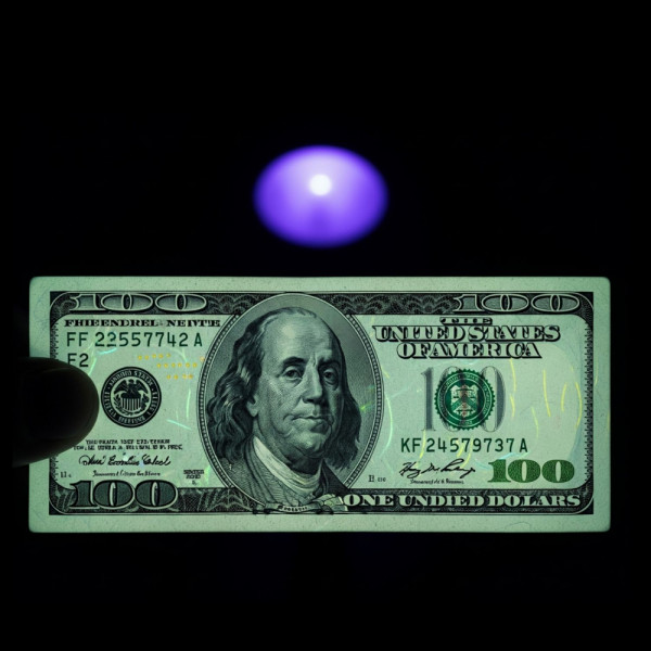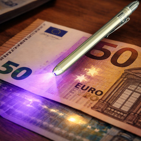 С този компактен UV детектор лесно ще разпознаете фалшиви пари. Само насочете светлината към банкнотата и вижте защитните UV елементи, които се появяват при истинските пари.