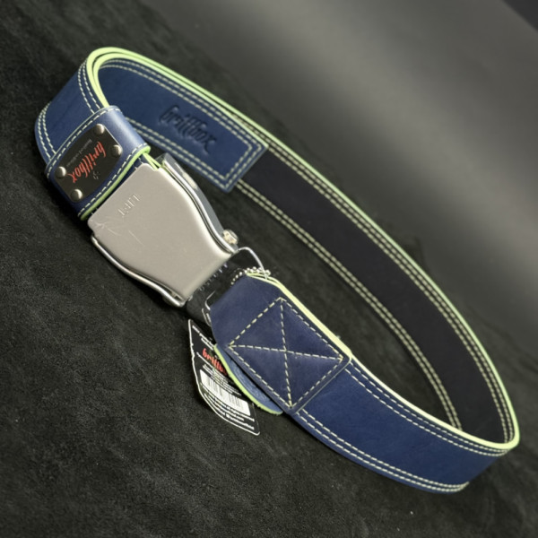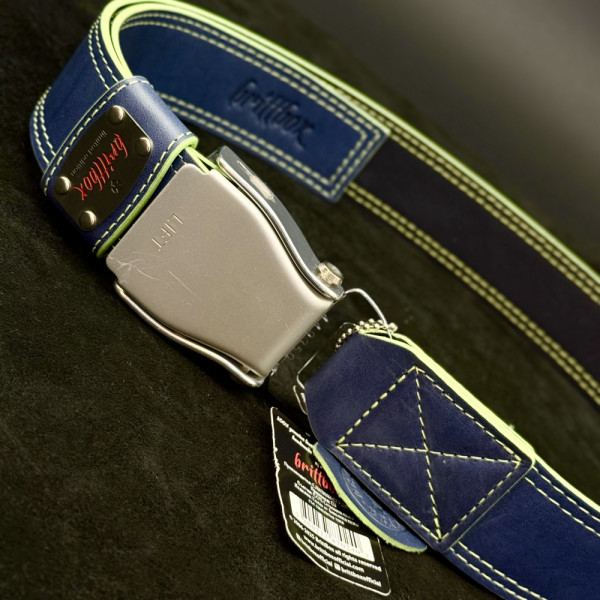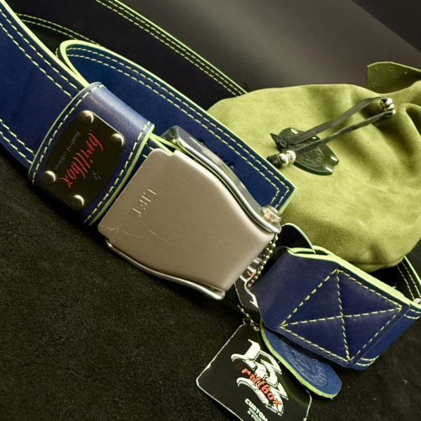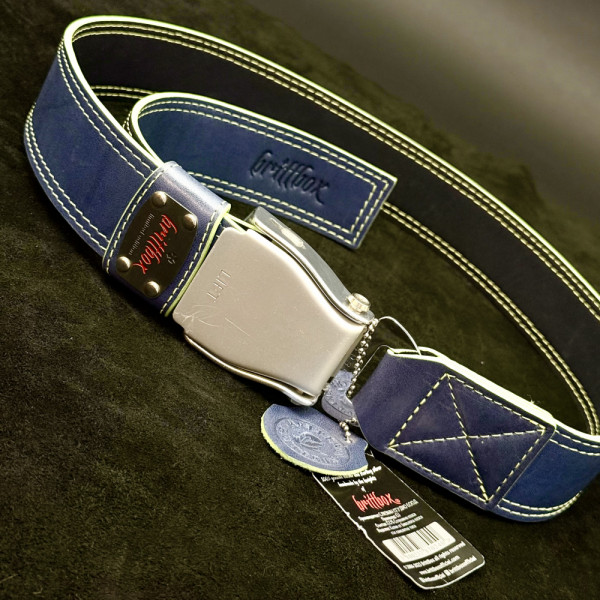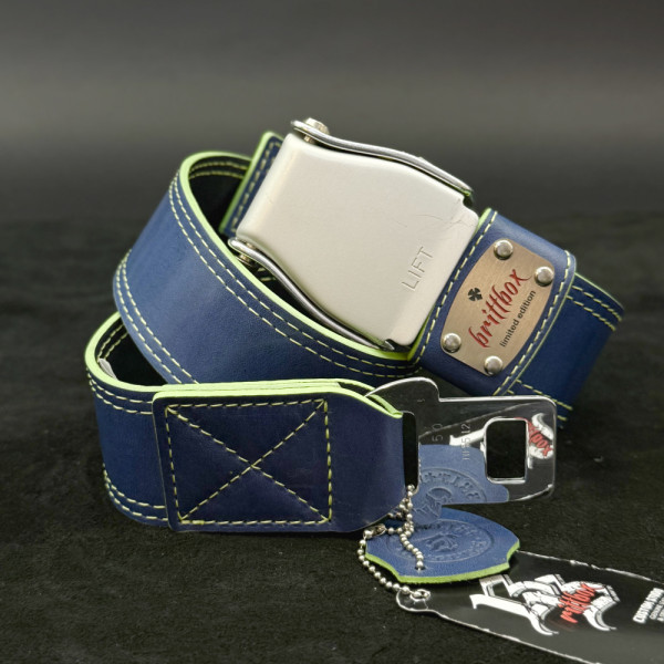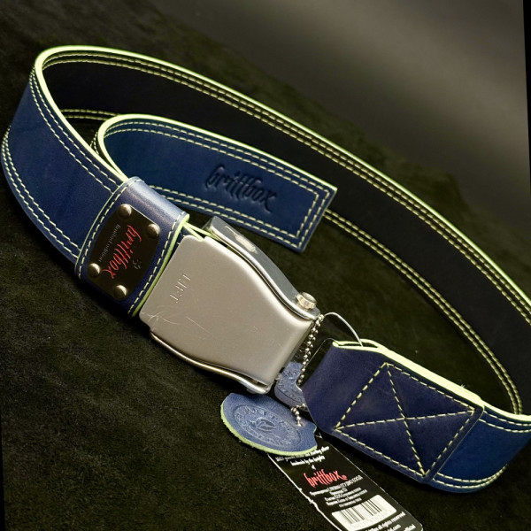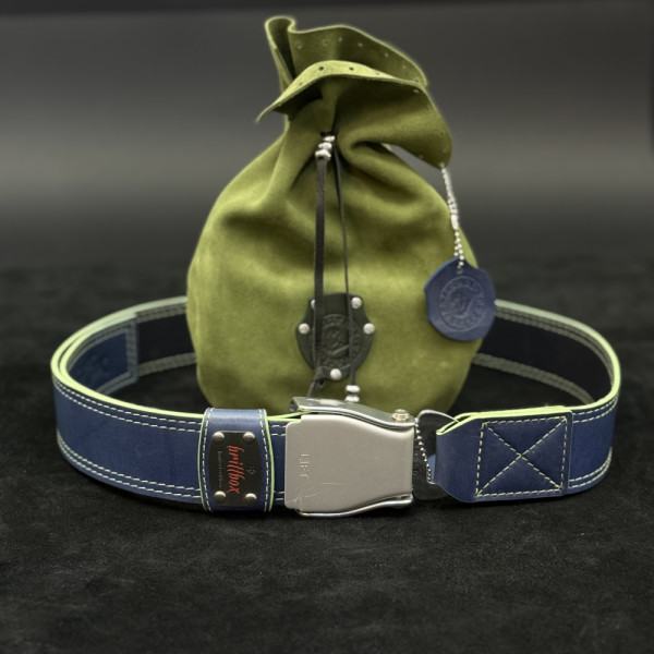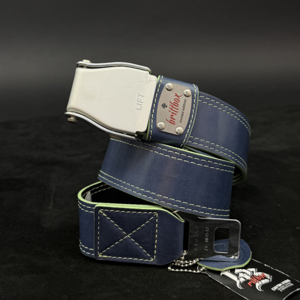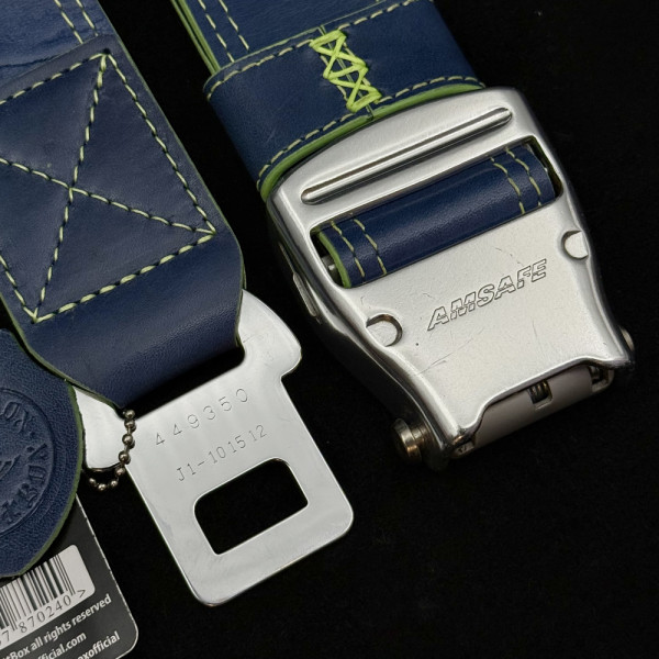 Единствен по рода си авио колан BRITTBOX BELT BLUE-GREEN с истинскасамолетна тока от колан BOEING, телешки бокс, подаръчна торба от напа