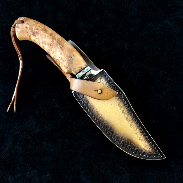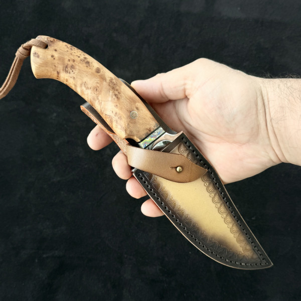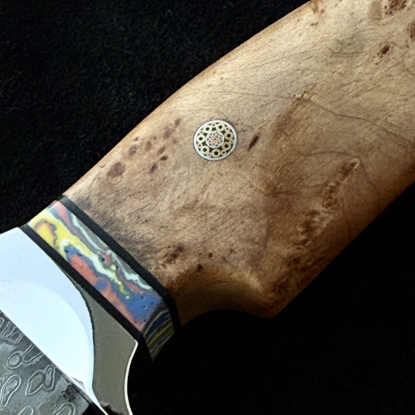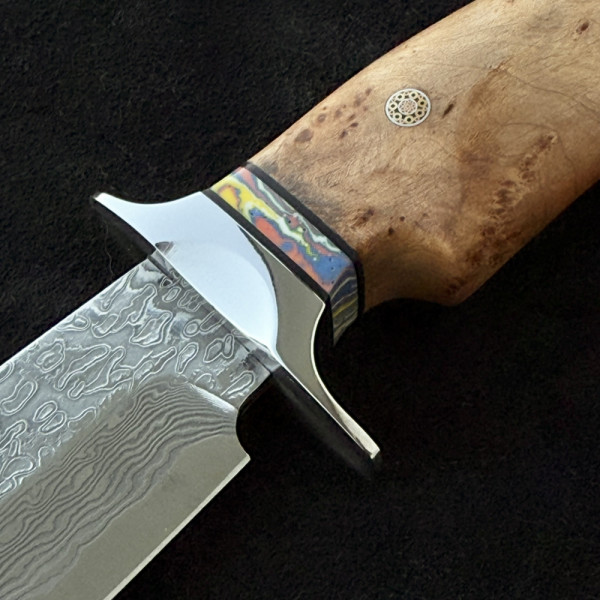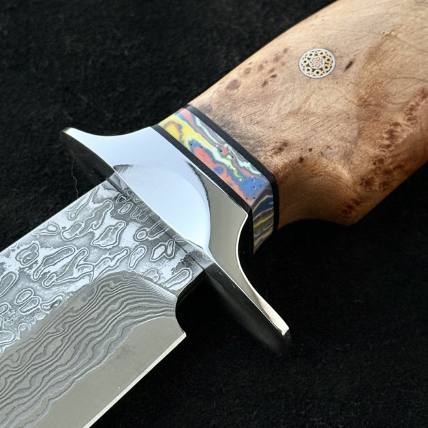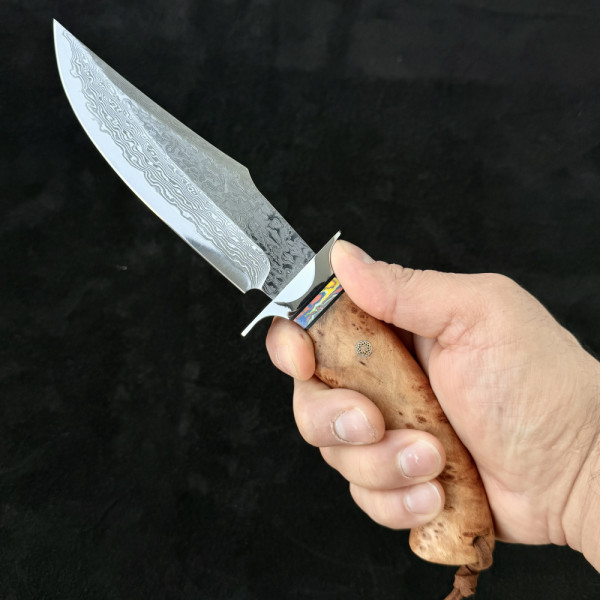 Висококачествен немски ловен нож от дамаска стомана с VG10 подложка и 67 слоя ламинат. Екзотична извита форма. Чудесна дървена дръжка с мозаечен пин и красива телешка кания