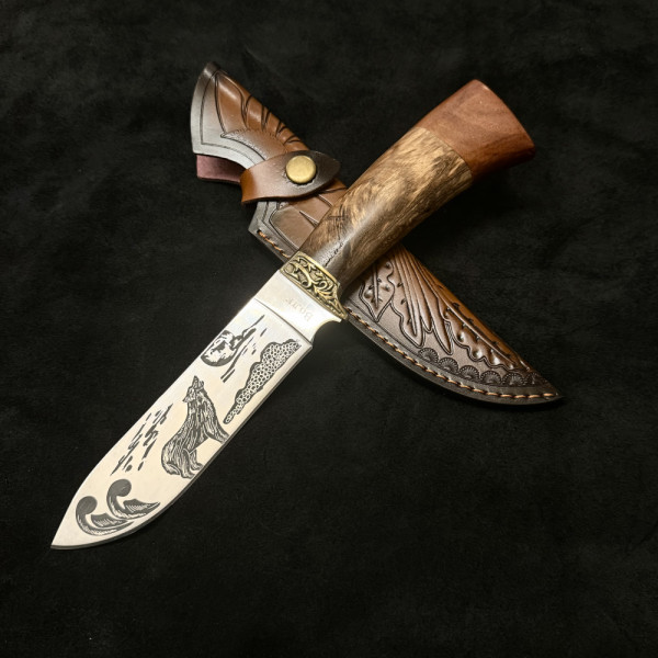 Голям екзотичен ловен нож, руски ВОЛК, класическа стомана 65х13, страхотна дръжка от орех и стабилизиран тумор, гравирана кания телешки бланк
