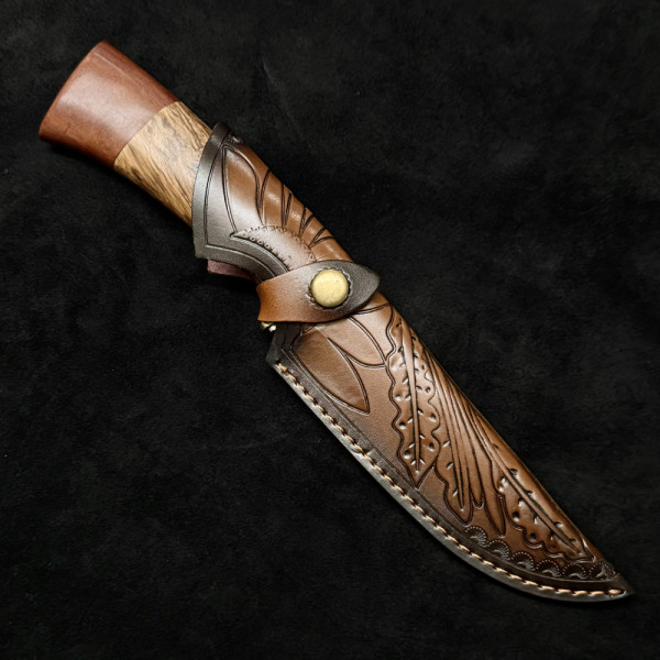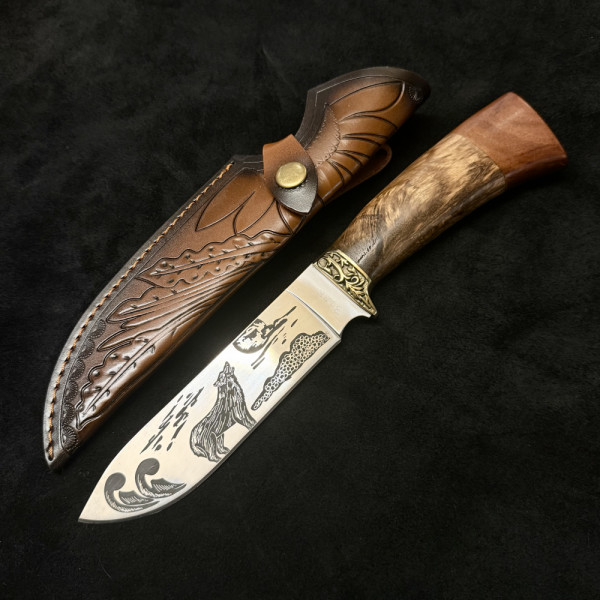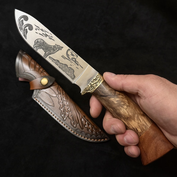 Голям руски ловен нож ВОЛК, стомана 65х13, кожена кания, дръжка орех и стабилизиран тумор