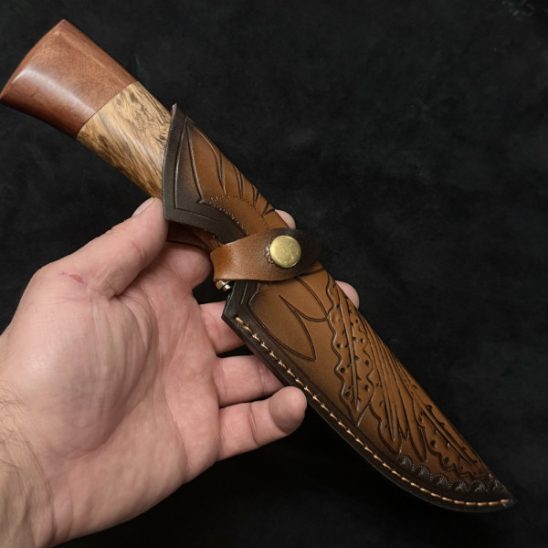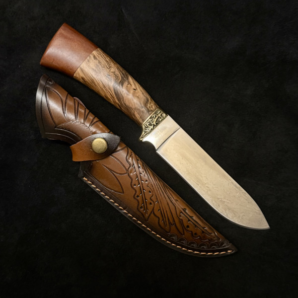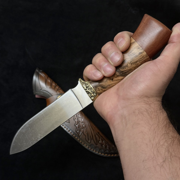1149 Отзива за Голям руски ловен нож ВОЛК, стомана 65х13, кожена кания, дръжка орех и стабилизиран тумор