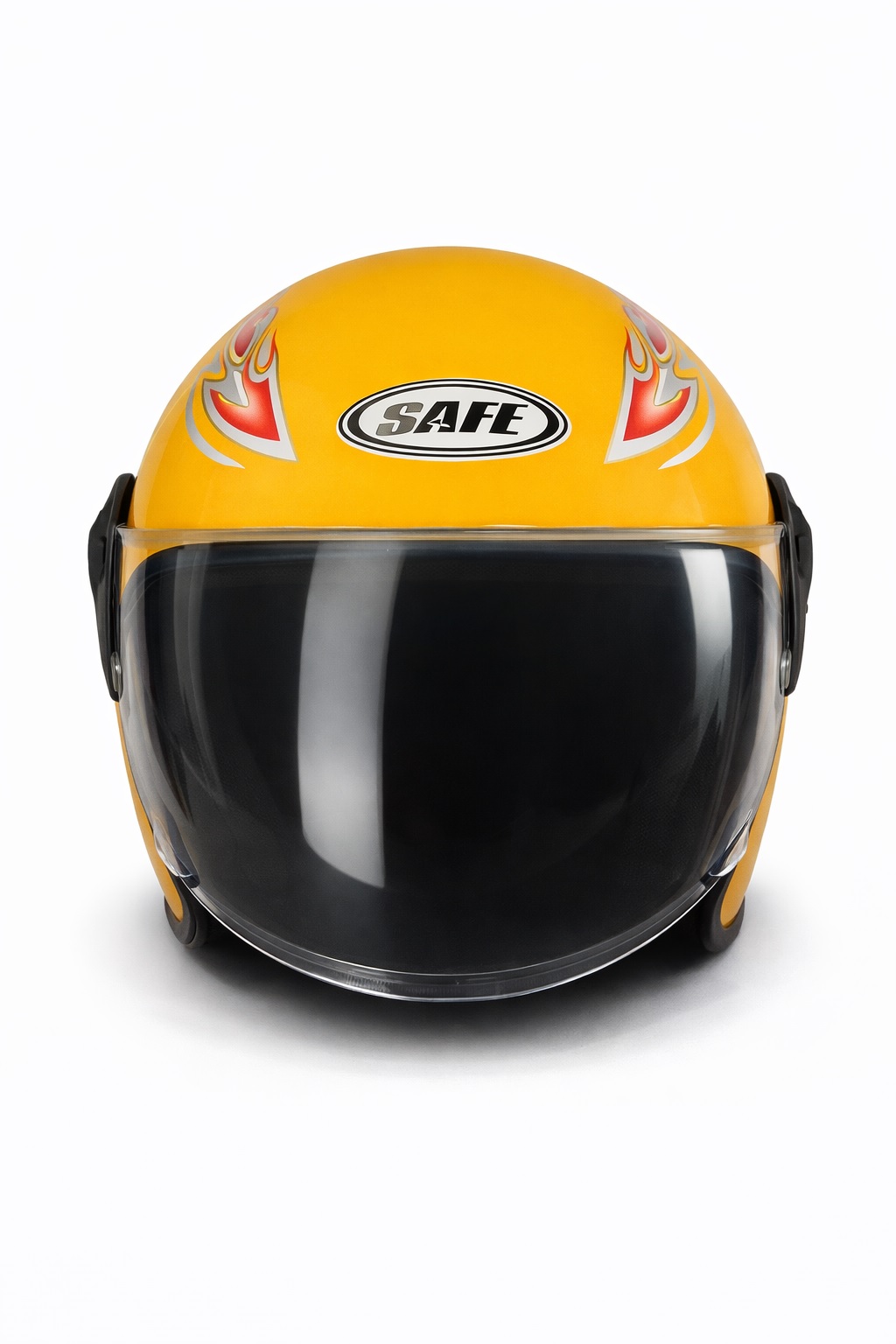 Практична и удобна отворена мото каска SAFE, подходяща за каране на мотор, скутер, мотопед или ATV.Каската е с модерен дизайн в жълт металик с декоративна графика и оборудвана с прозрачен визьор, който предпазва лицето от вятър, прах и насекоми.