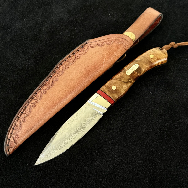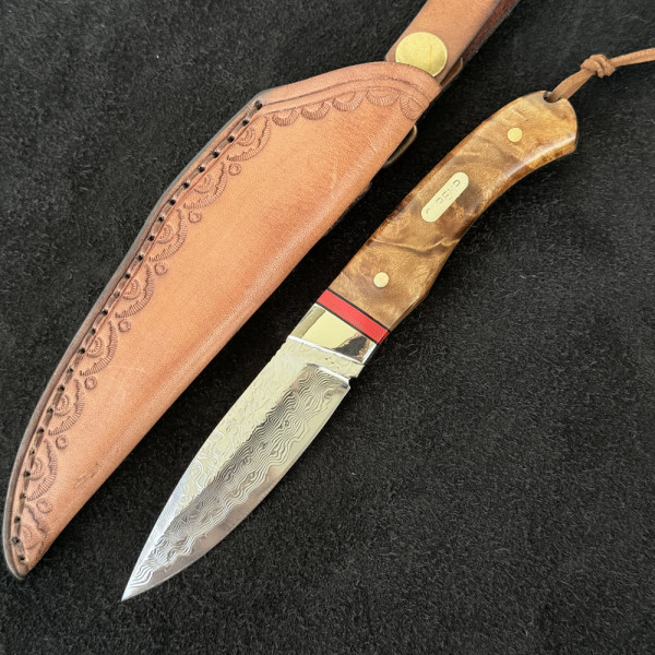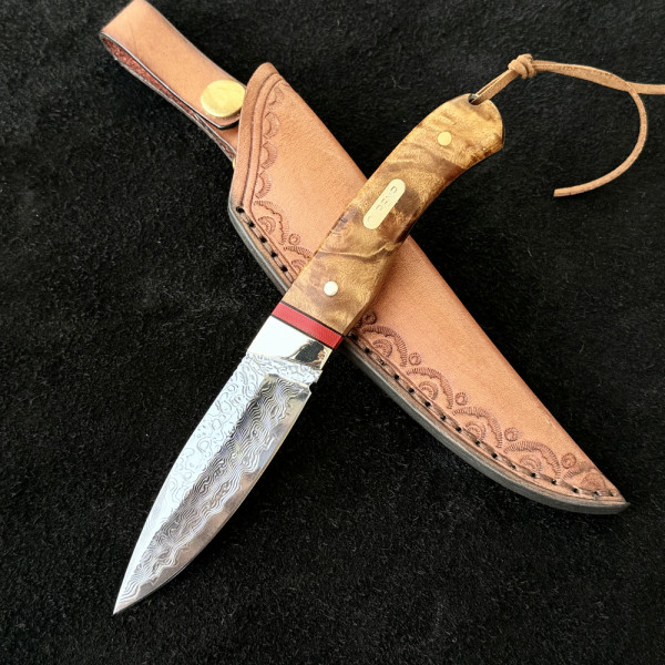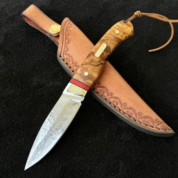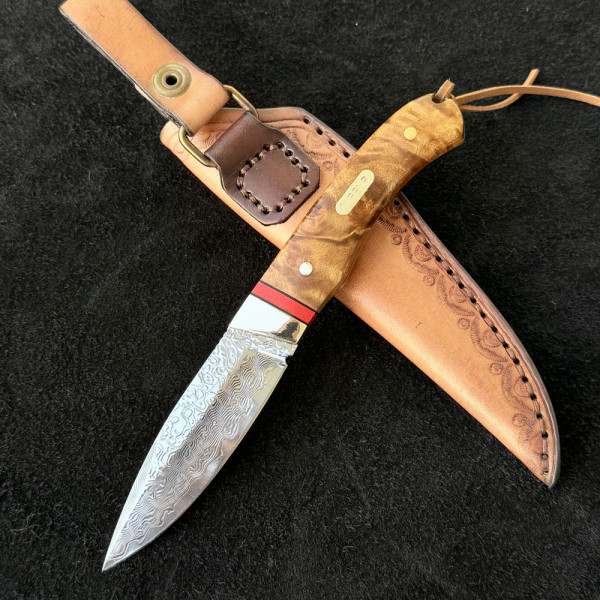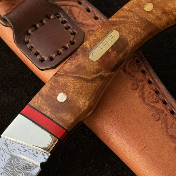Компактен японски ловен нож от дамаска стомана, фултанг с чирени от орехово дърво с инкрустиран месинг лого и кожена кания- бижу за ценители