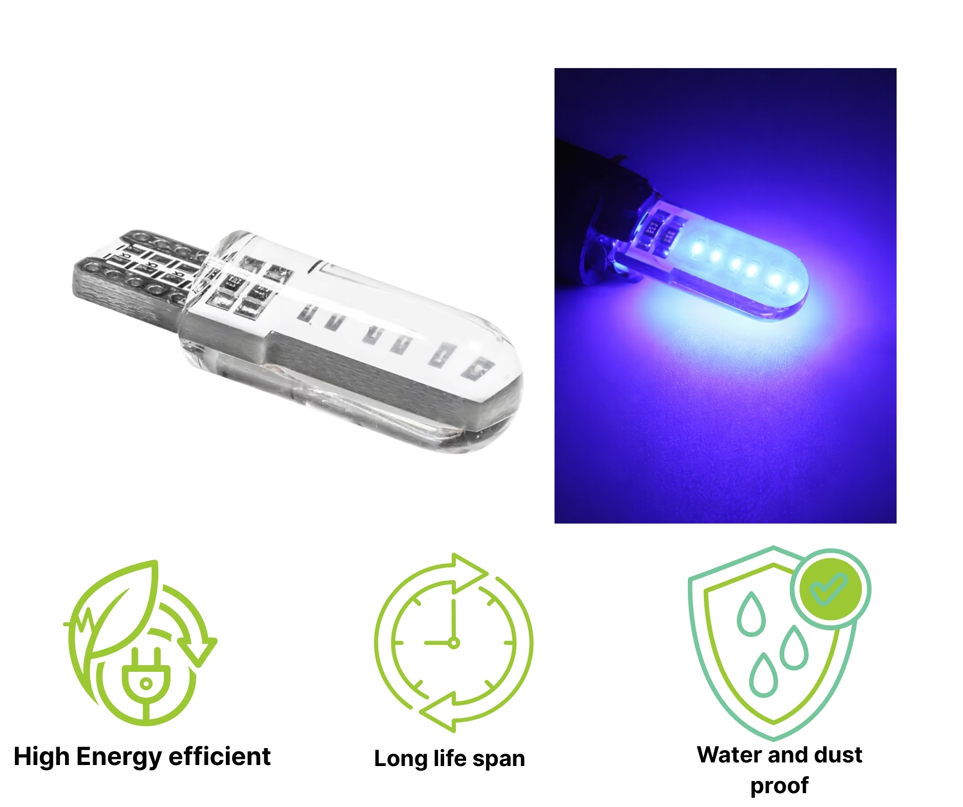 Комплект LED крушки T10 (W5W) проектирани да осигурят ефективно осветление, ниска консумация на енергия и модерен външен вид на вашия автомобил.Благодарение на Silica LED технологията и CANBUS съвместимостта, крушката гарантира стабилна работа, ефективно разсейване на топлината и намалява вероятността от появата на грешки на таблото.