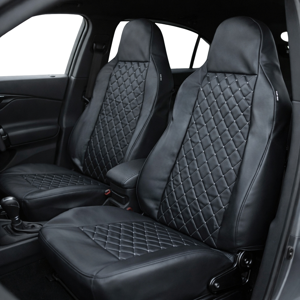 Висококачествена интегрирана тапицерия за предните седалки на автомобил, изработена от еко кожа с елегантен капитониран дизайн. Моделът е създаден да придаде модерен и луксозен вид на интериора, като същевременно осигурява комфорт и защита на оригиналните седалки.