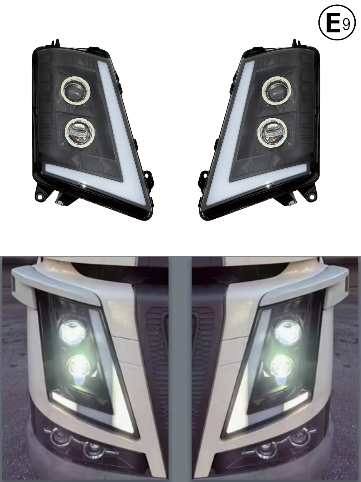 Комплект висококачествени LED фарове с къси, дълги и дневни (DRL) светлини, специално проектирани за моделите VOLVO FH4 / FM4 2012+ г.Осигуряват модерна визия, значително подобрено осветяване и пълна съвместимост с оригиналните монтажни точки.