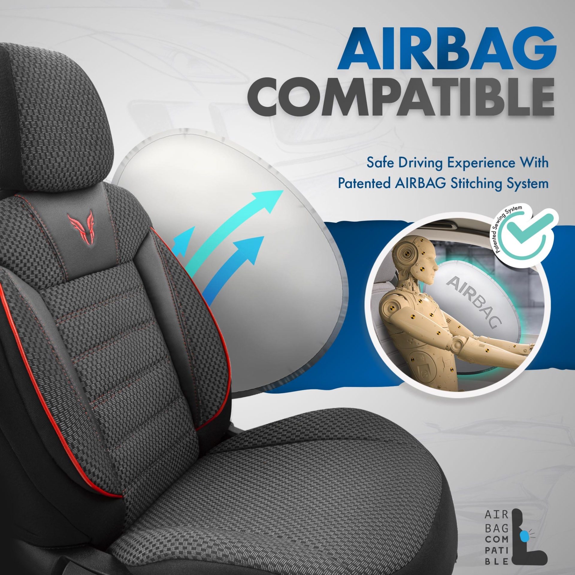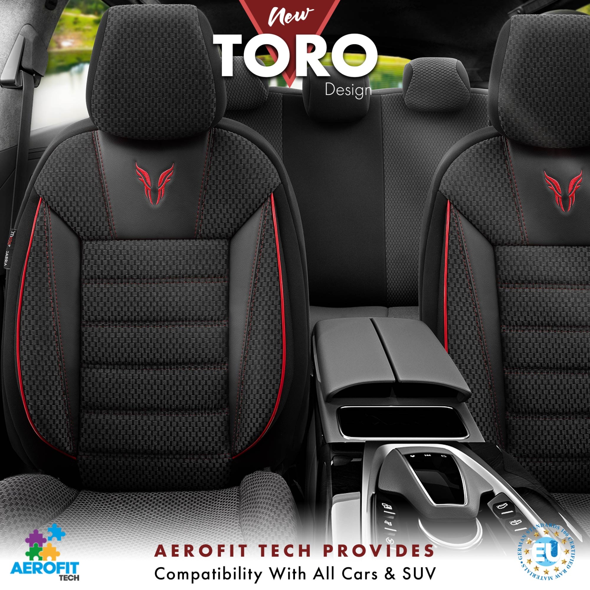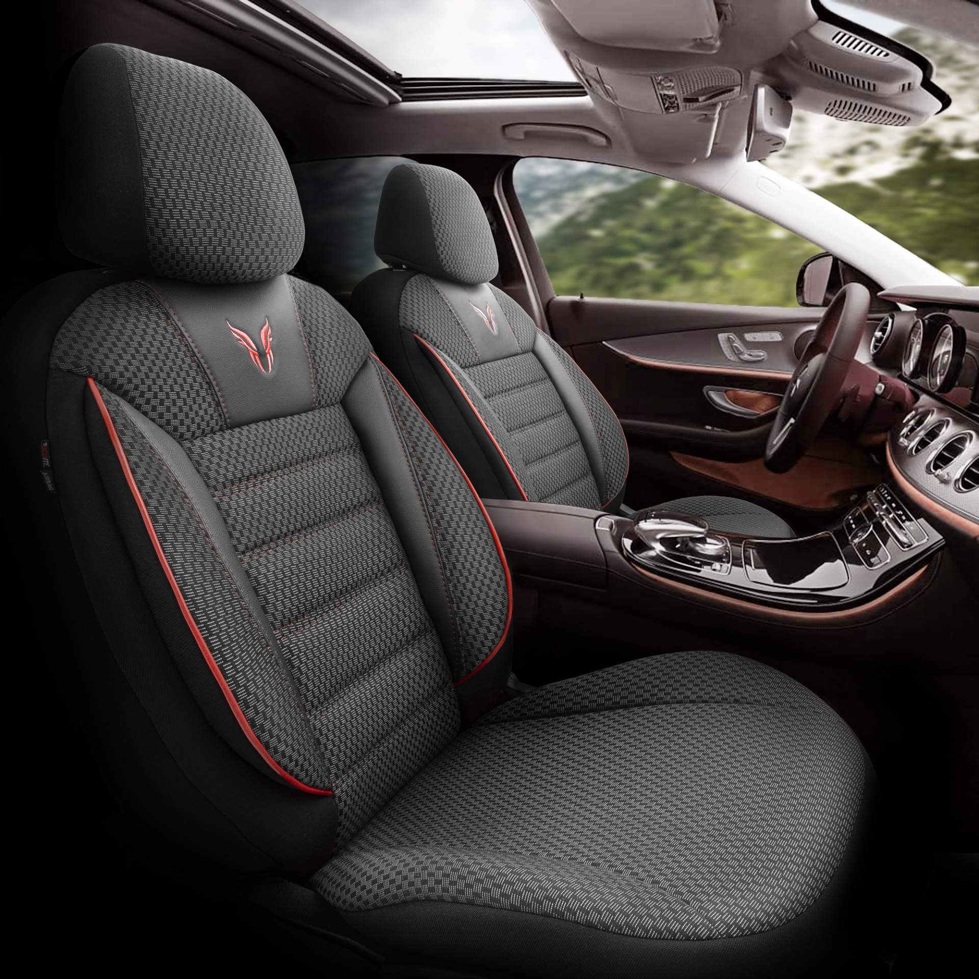 Комплект Луксозна Тапицерия текстил с еко кожа TORO Design – Черна с червен шев, за Предни и Задни Седалки