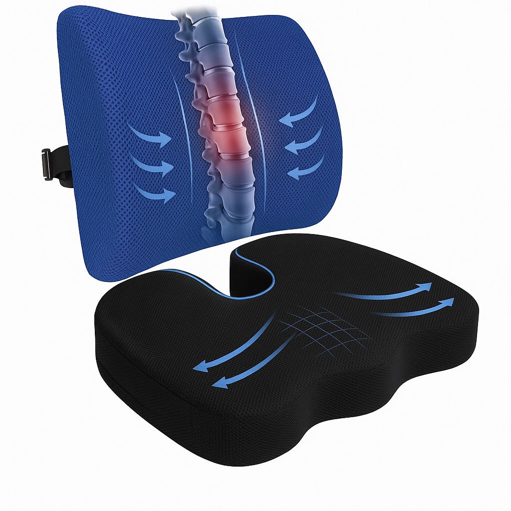 Този ергономичен комплект е създаден да осигурява оптимален комфорт и да намалява натоварването върху гръбначния стълб при продължително седене.Включва лумбална възглавница с анатомична форма и ортопедична възглавница за седене, изработени от висококачествена мемори пяна.Идеални за използване в офиса, в автомобила или у дома.