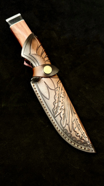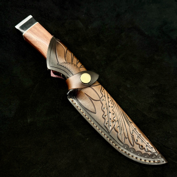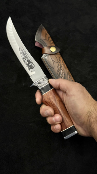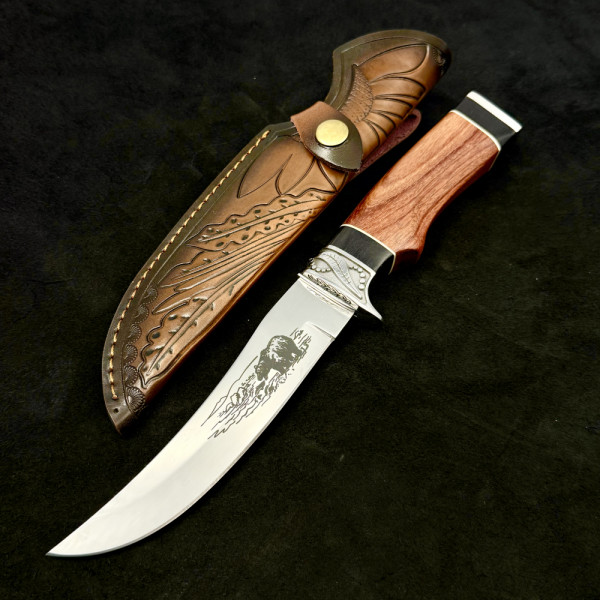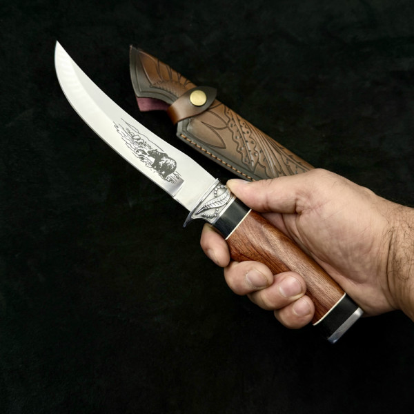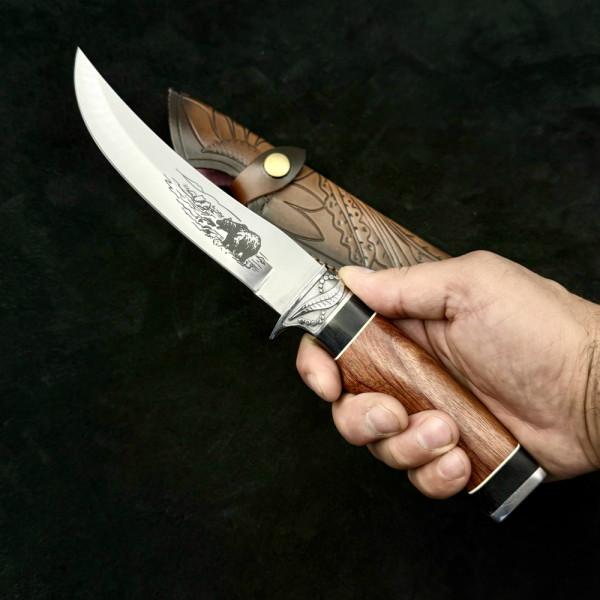 Красив ловен нож WPKOPYA 207 HUNTING BEAR с извито острие от стомана 5CR13, дръжка череша, гравирана кожена кания, стоманен гард, стоманен гард - нож мечта!