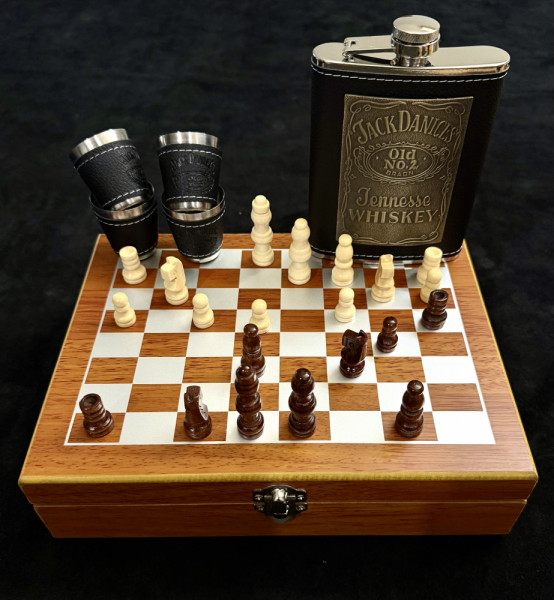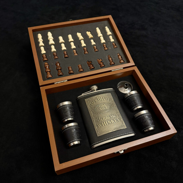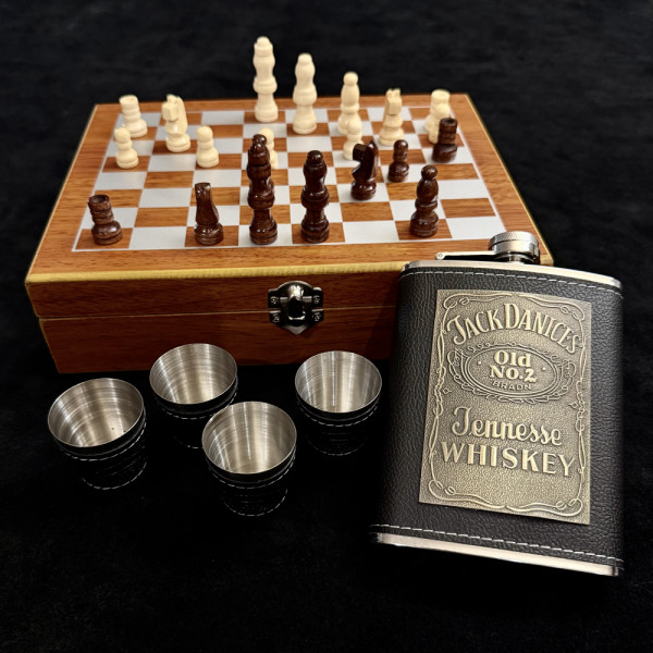 Луксозен дървен шах комплект Jack Daniel's - дървен кутия-дъска, манерка и 4 чаши