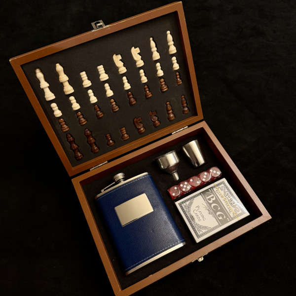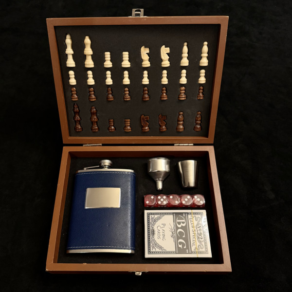 Луксозен дървен комплект за игра в дървена кутия: шах, зарове, тесте карти, манерка с настроение, шашка и фуния