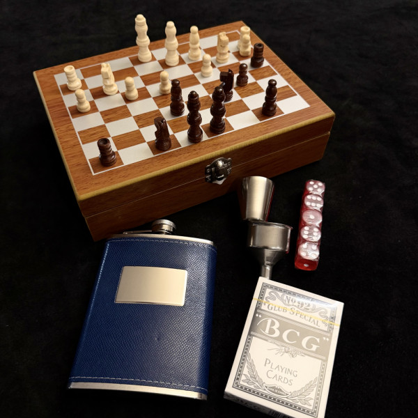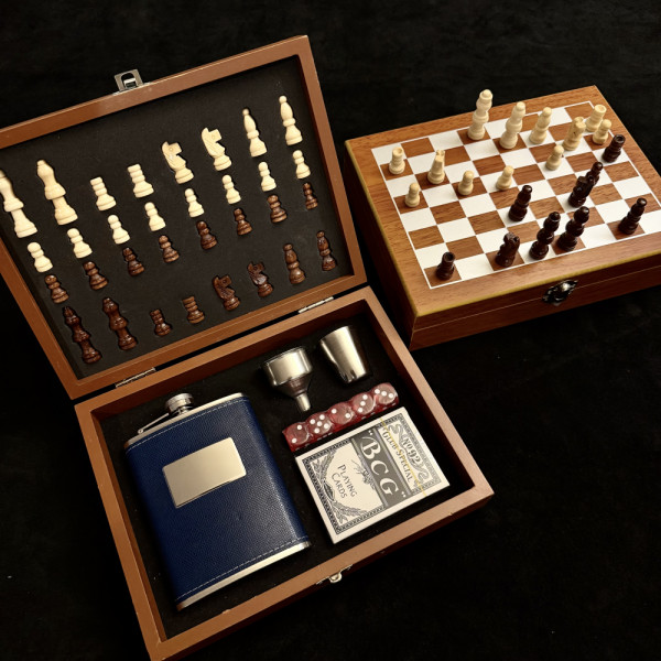 Луксозен подарък: шах комплект с дървена дъска- кутия заедно със стоманена манерка и чашка, тесте с карти за игра и комплект зарове