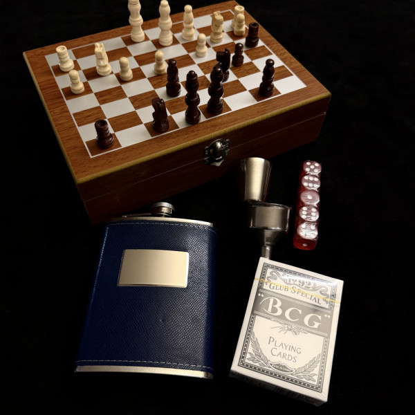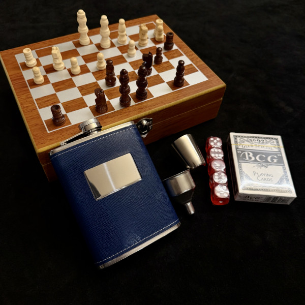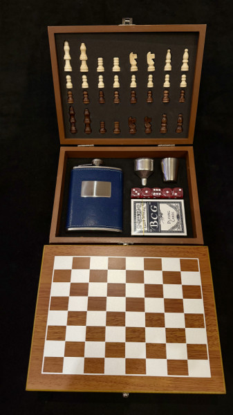 1149 Отзива за Луксозен дървен шах комплект LAS VEGAS - дървен кутия-дъска за шах, комплект зарове, тесте карти, манерка, чаша и фуния манерка и 4 чаши