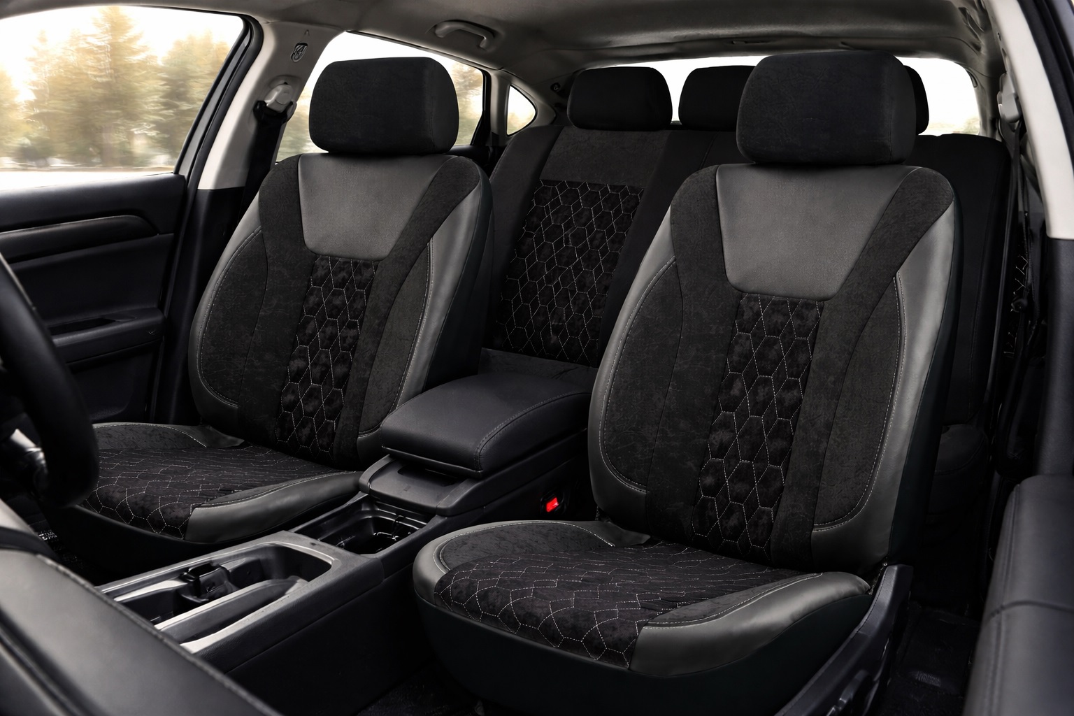 Стилен и практичен комплект универсални калъфи за автомобилни седалки, съчетаващ модерен черно/сив дизайн с декоративен шестоъгълен шев.