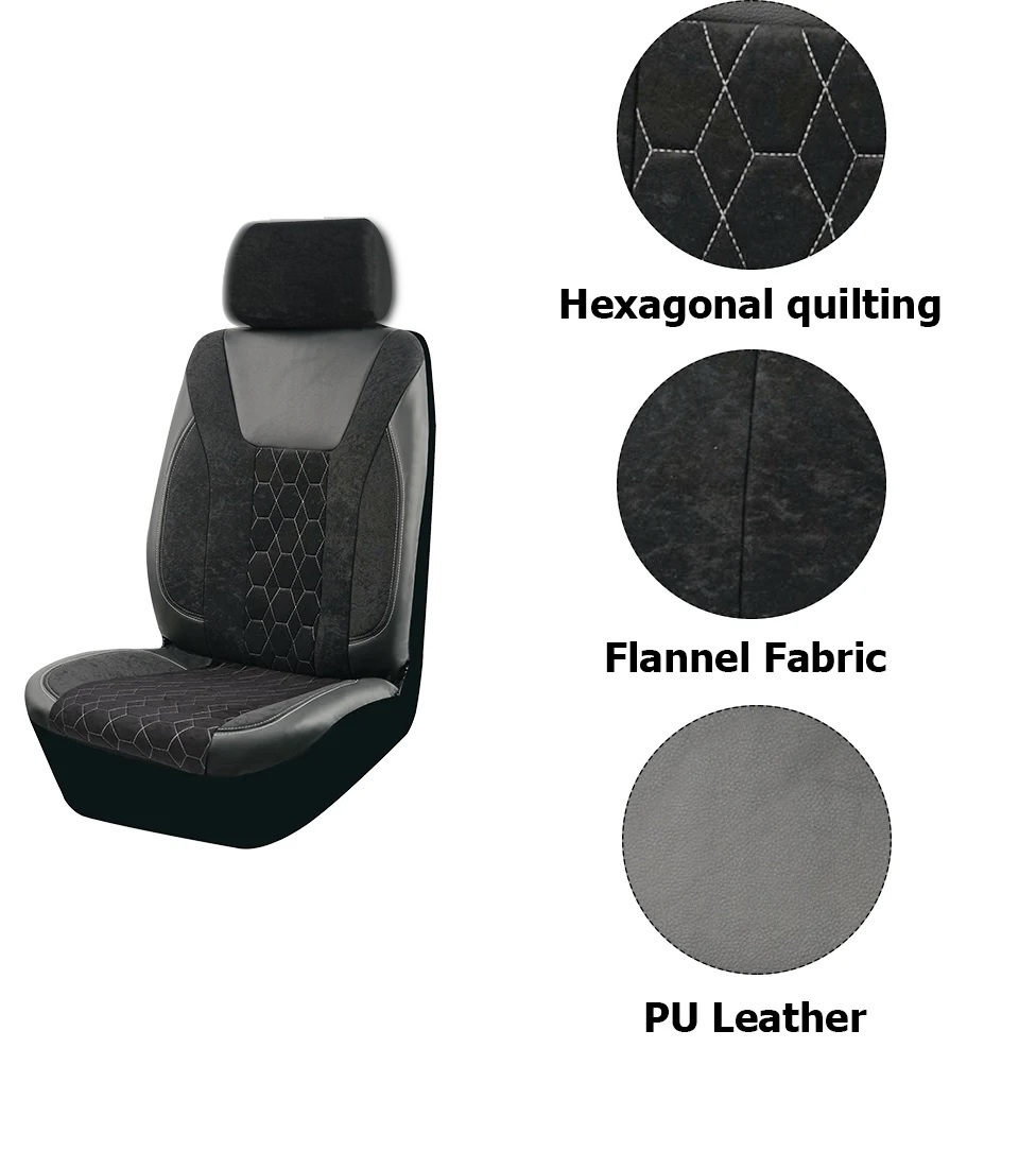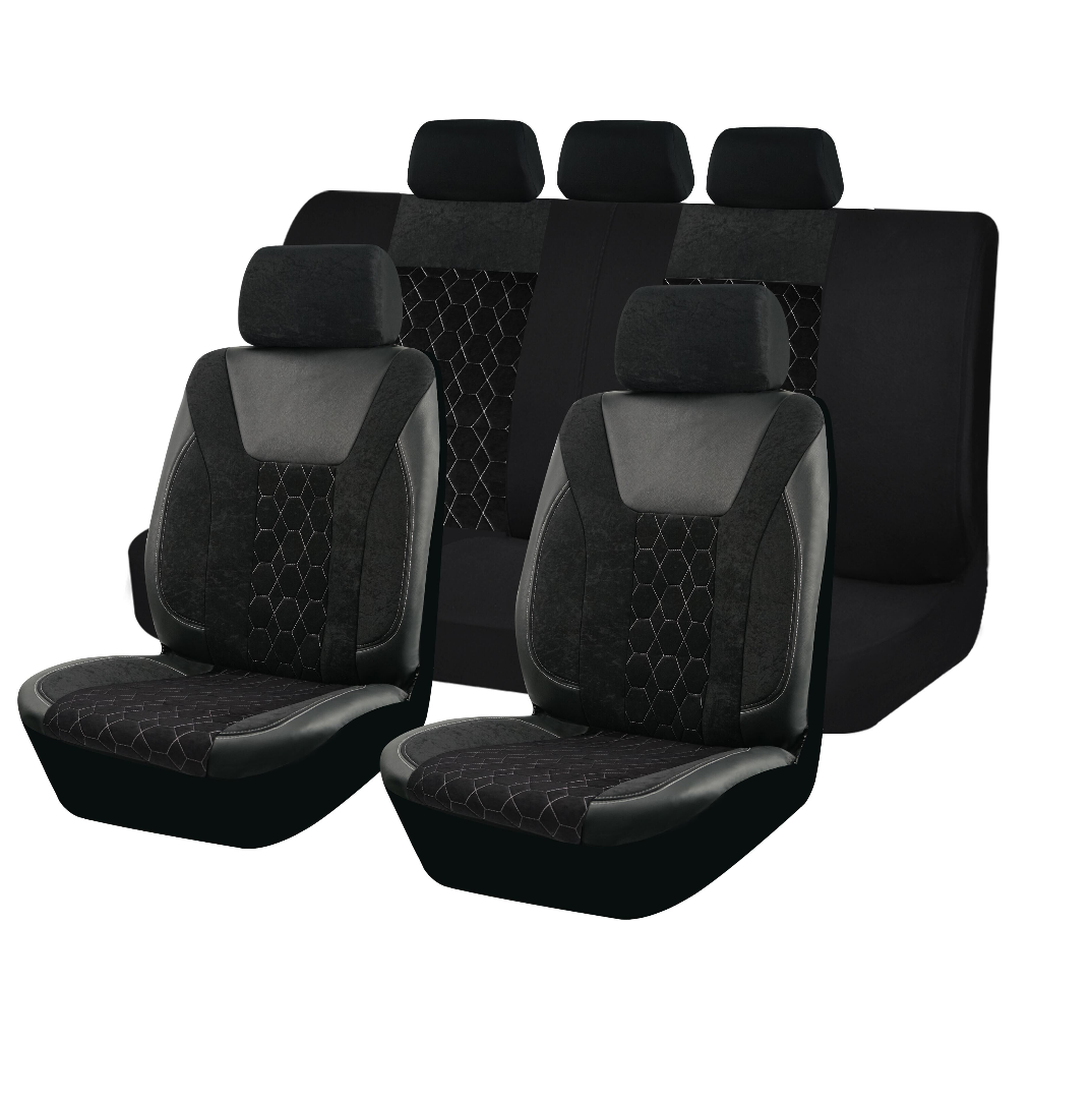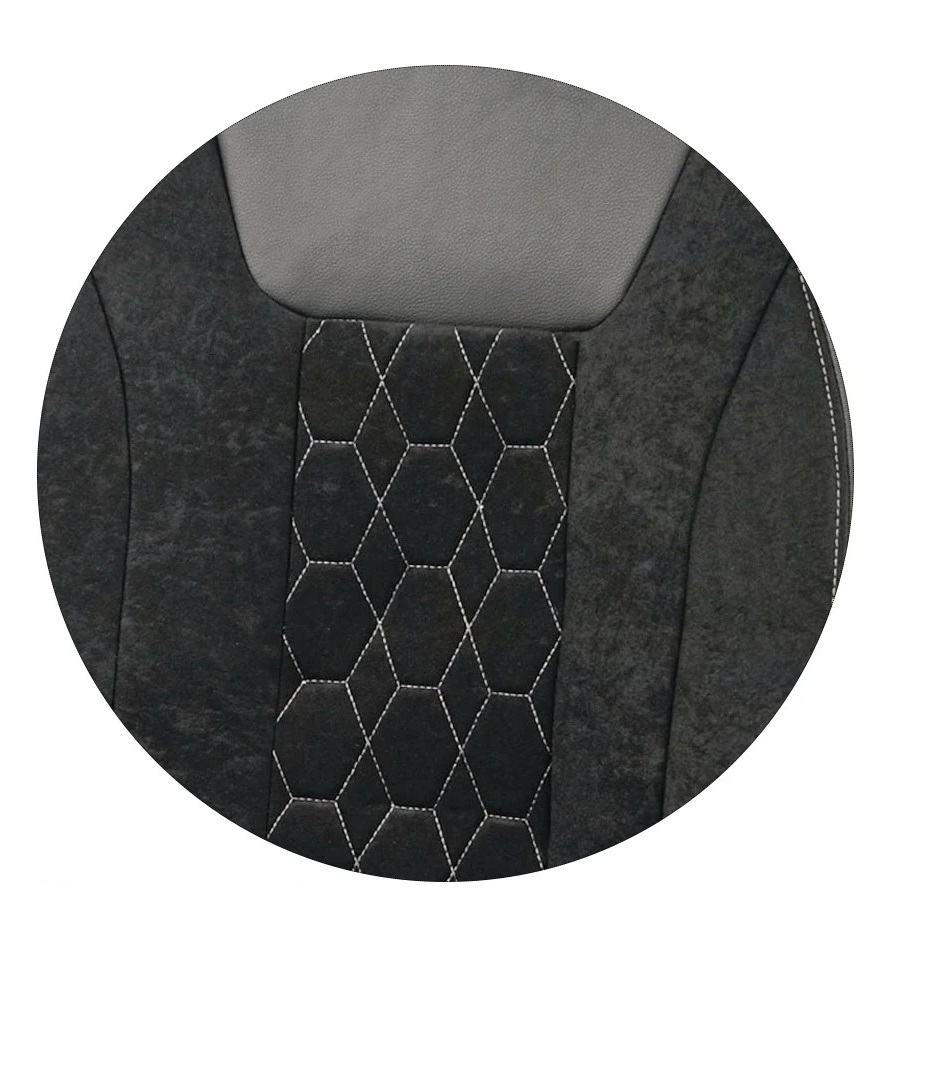Стилен и практичен комплект универсални калъфи за автомобилни седалки, съчетаващ модерен черно/сив дизайн с декоративен шестоъгълен шев.Изработени от комбинация от висококачествена еко кожа, мек текстил и устойчив полиестерен плат за комфорт, издръжливост и лесна поддръжка.