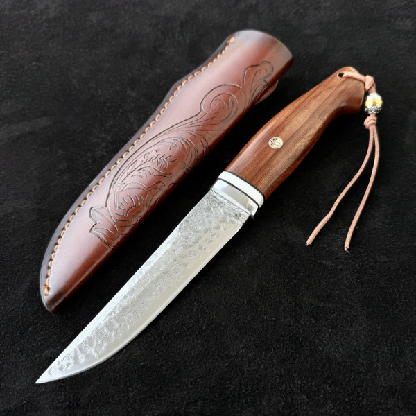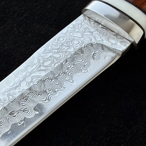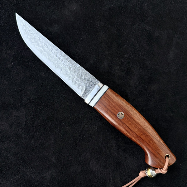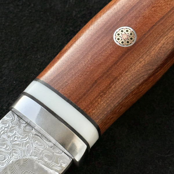 Висококачествен немски ловен нож от дамаска стомана с VG10 подложка и 67 слоя ламинат. Чудесна орехова дръжка с мозаечен пин и красива телешка кания