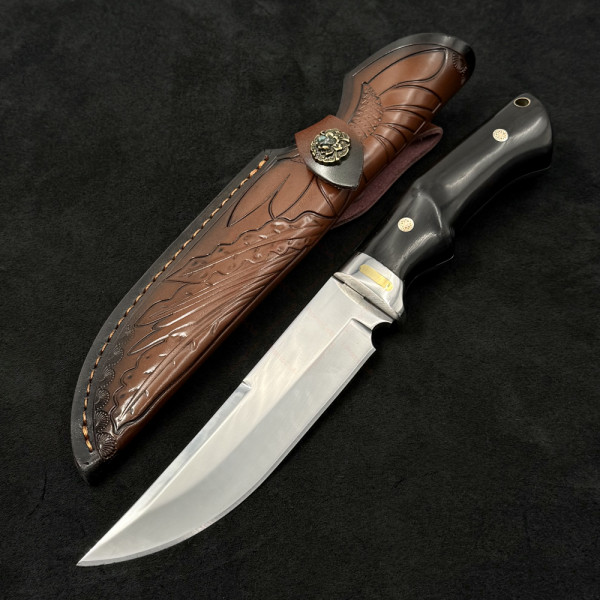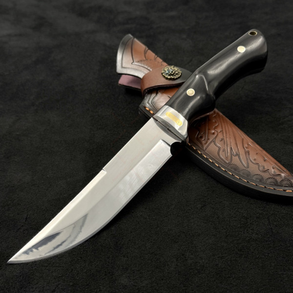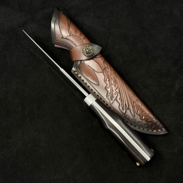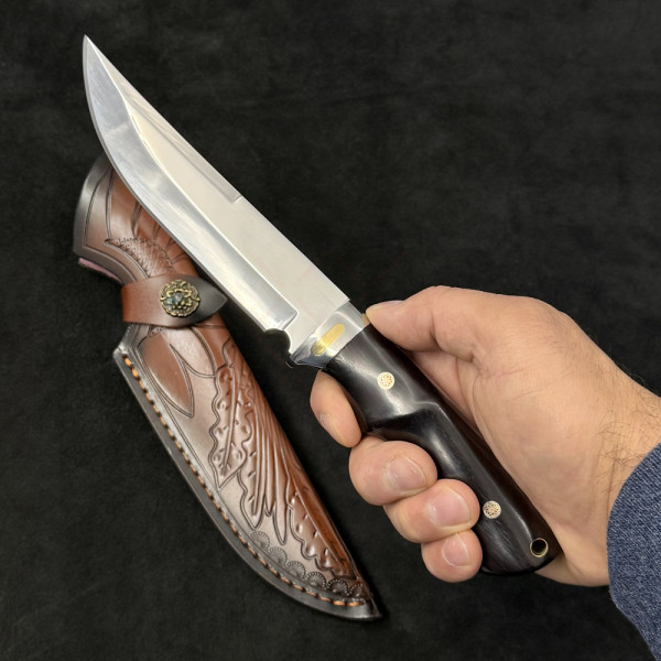 Огромен ловен нож DER HUNT 756, фултанг стомана 9Cr13Mov, дръжка махагон, гард стомана и месинг, кожена кания
