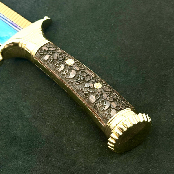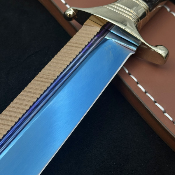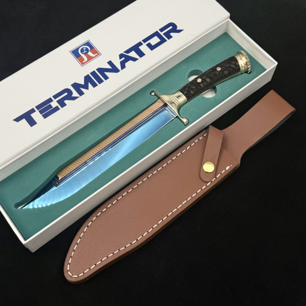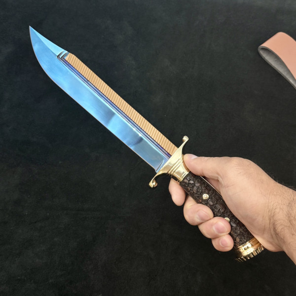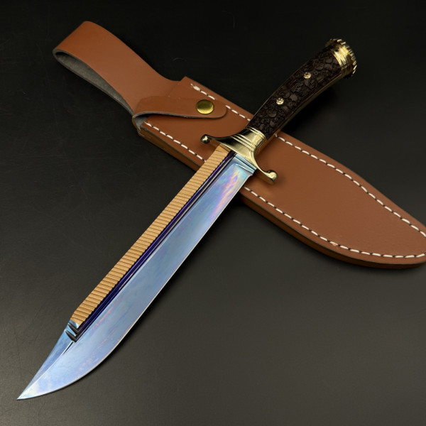 1149 Отзива за Огромен трофеен нож TERMINATOR, многокомпонентно острие и дръжка, гард и тапа отполиран месинг, кожена кания от телешки бланк