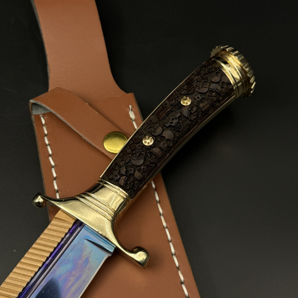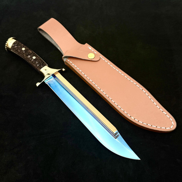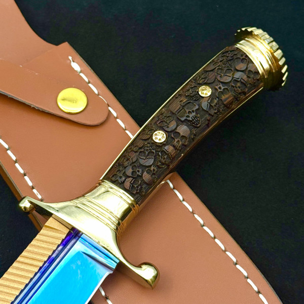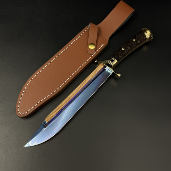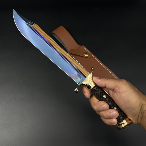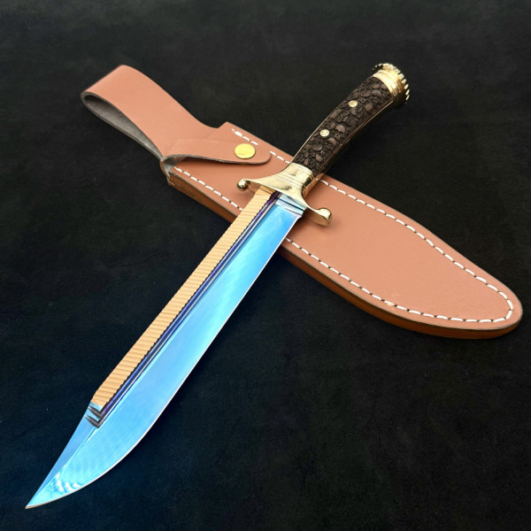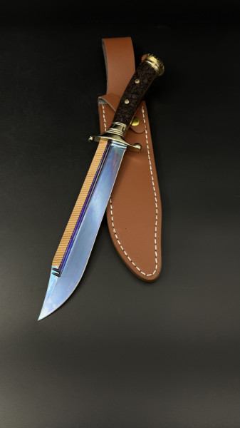 Огромен трофеен нож TERMINATOR, многокомпонентно острие и дръжка, гард и тапа отполиран месинг, кожена кания от телешки бланк