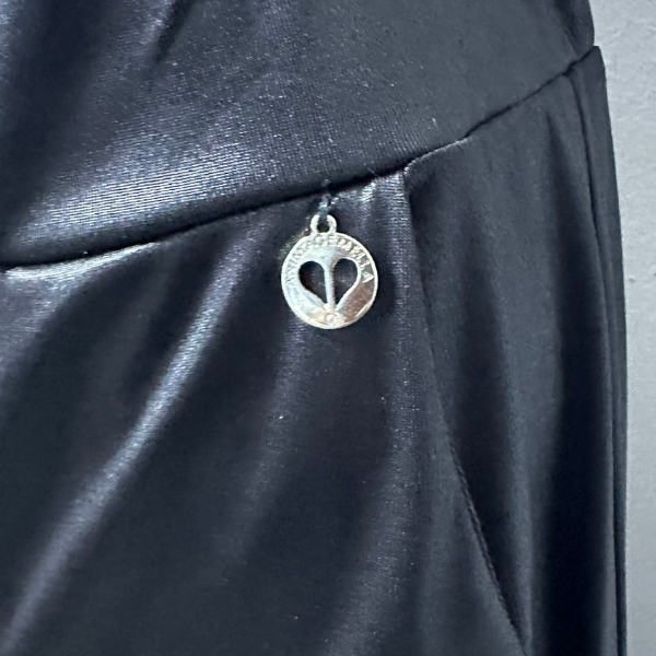 Моделът е с висока талия и ефектна линия, напомняща пола-панталон, което придава изключителна женственост и комфорт при движение. Черният цвят „Nero“ е класика – лесен за комбиниране с всякакви ризи, топове и сака. Материята е лека и фино падаща, създавайки елегантен силует. Малък метален медальон с логото на марката добавя завършващ акцент