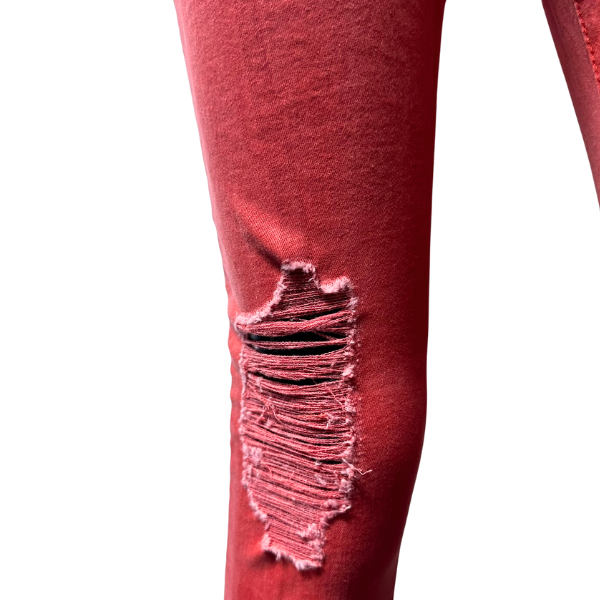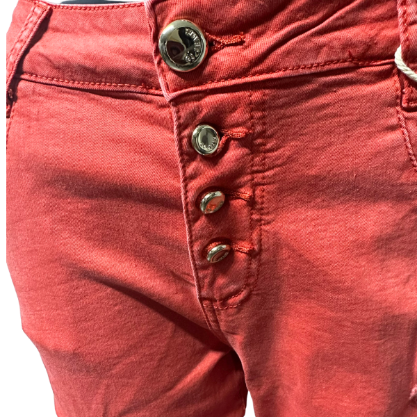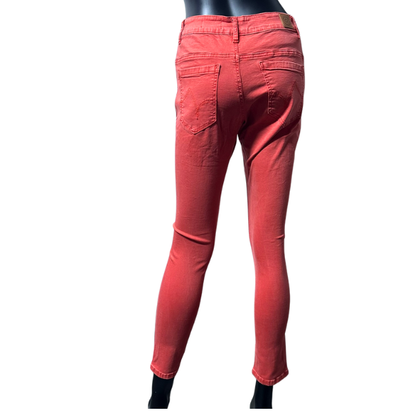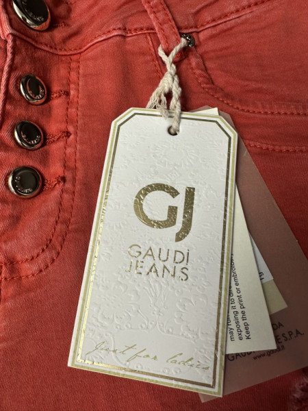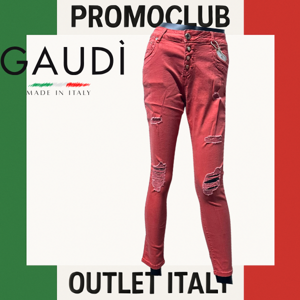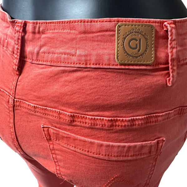 Модерен червен дамски панталон GAUDI JEANS с вталена кройка и ефектни прокъсвания. Акцент от четири метални копчета отпред и мека еластична материя.Подходящ за градски и ежедневен стил