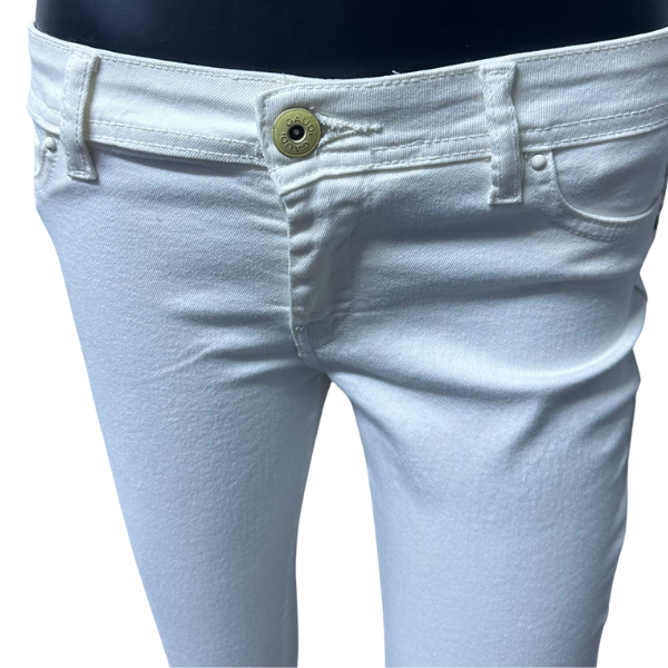 Дамски панталон Gaudì в класически бял цвят – елегантен и универсален модел, който подчертава силуета и се комбинира лесно с всякакъв стил. Изработен от мек и удобен деним с еластан, осигурява комфорт и свобода на движение през целия ден. Моделът е с тесен крачол, класическа 5-джобна кройка и закопчаване с цип и копче. Декориран е с брандиран етикет с брокатен ефект на колана, който добавя изискан детайл. Перфектен избор както за ежедневието, така и за по-специални поводи