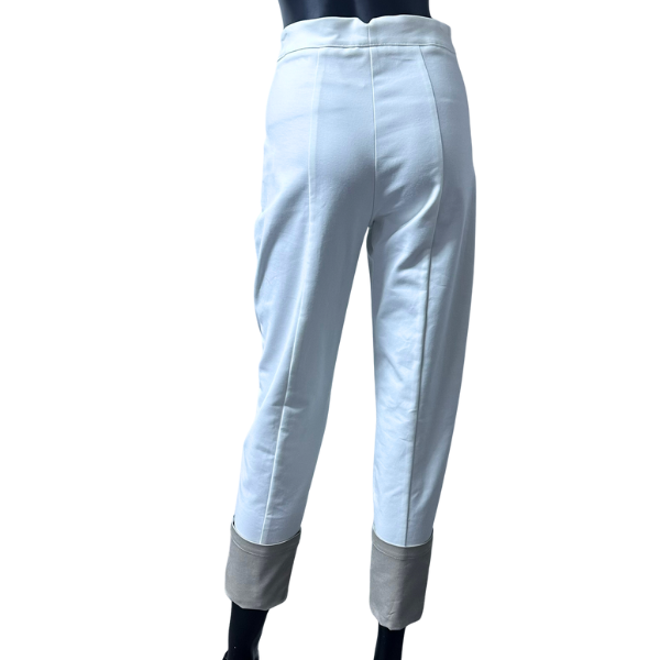 Моделът впечатлява с изчистена линия и висококачествена изработка, а контрастните маншети в долната част добавят модерен акцент. Закопчаването е с копче и цип, с дискретни предни джобове и леки басти за изтънчен силует. Универсален и стилен, подходящ както за официални събития, така и за ежедневието в комбинация с елегантни блузи или спортно-шик топове.