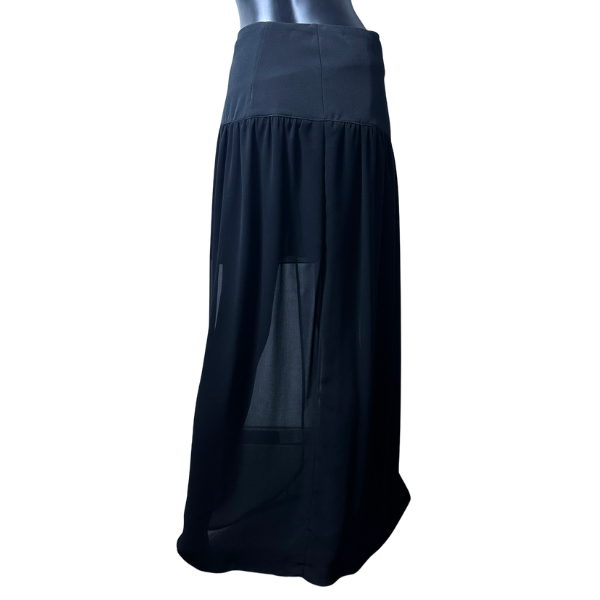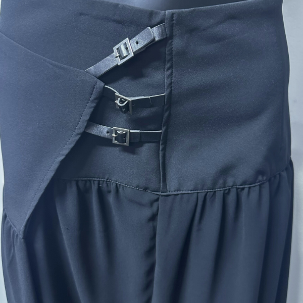 Моделът е с висока талия и оригинален дизайн, акцентиран с три декоративни катарами отстрани, които придават модерен и стилен вид. Платът е леко прозрачeн в долната част, което добавя женственост и финес. Полата е подходяща за вечерни събития, официални поводи или комбинация с изчистен топ за впечатляваща визия