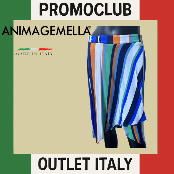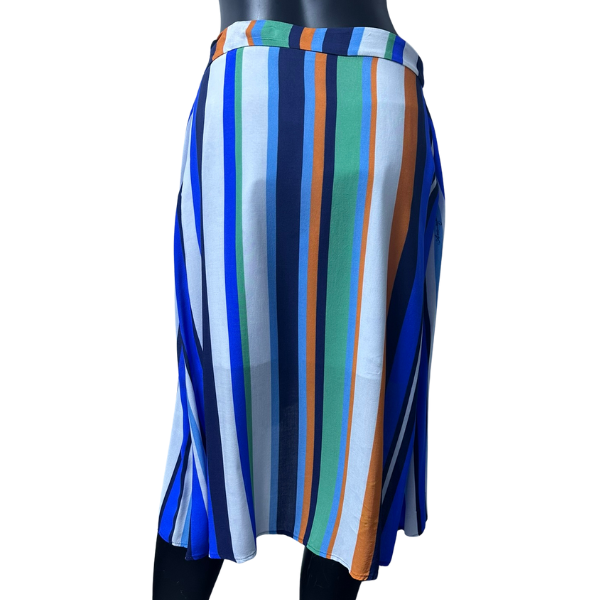 Стилна и модерна пола с асиметричен дизайн и пъстри вертикални райета в синьо, зелено, бяло и оранжево. Изработена е от 97% памук и 3% еластан, което я прави удобна, мека и леко еластична за перфектно прилягане. Талията е подчертана, а свободната кройка с неправилен подгъв придава динамика и елегантност. Универсален модел, който лесно се комбинира както с тениска за ежедневието, така и с елегантна блуза за по-специални поводи