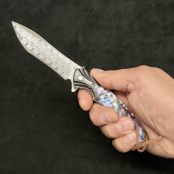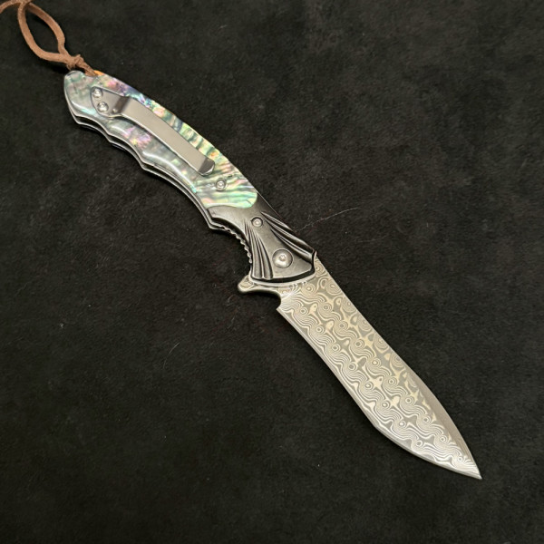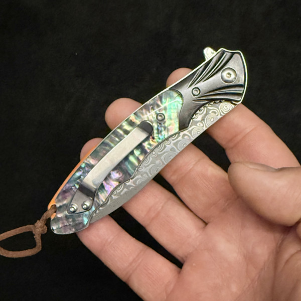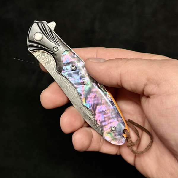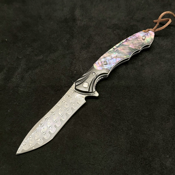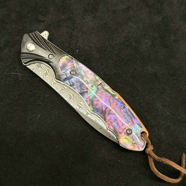 Красив сгъваем полу-автоматичен ТОП нож от дамаска стомана, палец за безотказно отваряне с една ръка и коралова дръжка - бижу