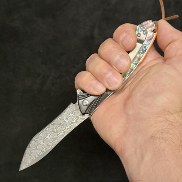 1149 Отзива за Полуавтоматичен сгъваем ТОП нож CORAL SCHELL DAMASKUS с палец за отваряне, стомана VG10 damask, дръжка G10, кутия