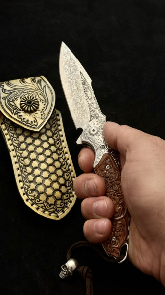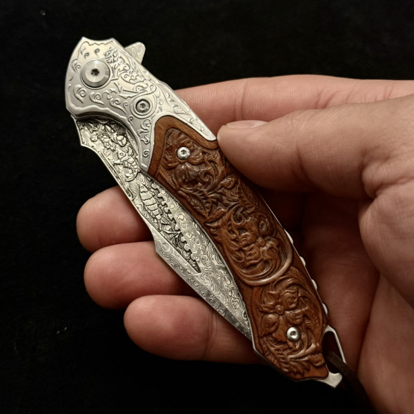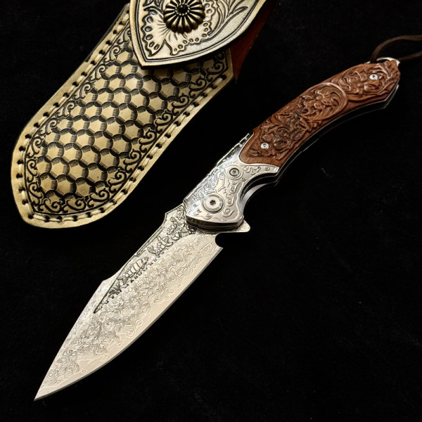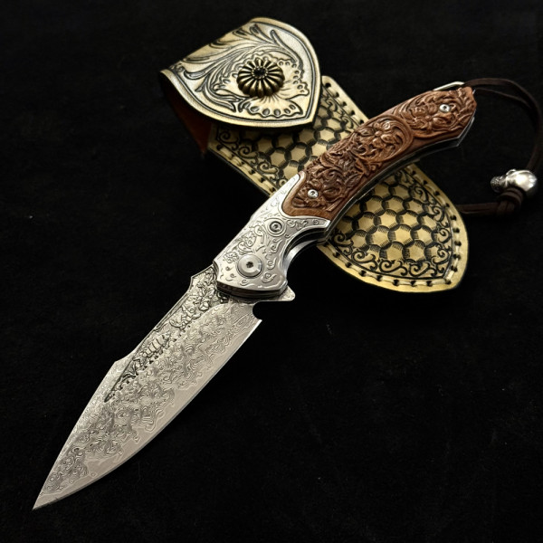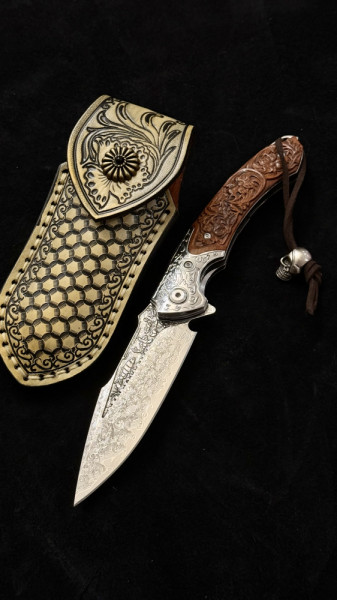 Най-висок клас масивен сгъваем нож от дамаска ТОП стомана и махагон. Висококачествено гравирано острие, дръжка и кания
