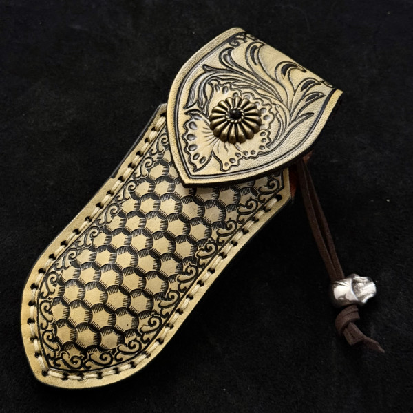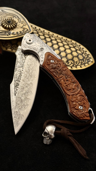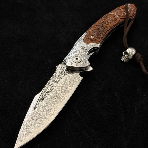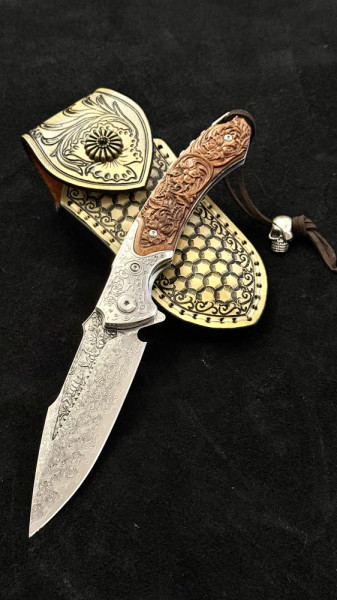 1149 Отзива за Полуавтоматичен сгъваем ТОП нож JAP SKULL DAMASKUS МК-17 с палец за отваряне, стомана VG10 damask, дръжка от гравиран махагон, кобур