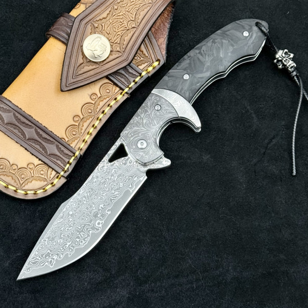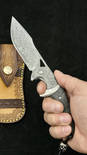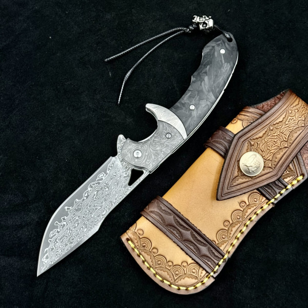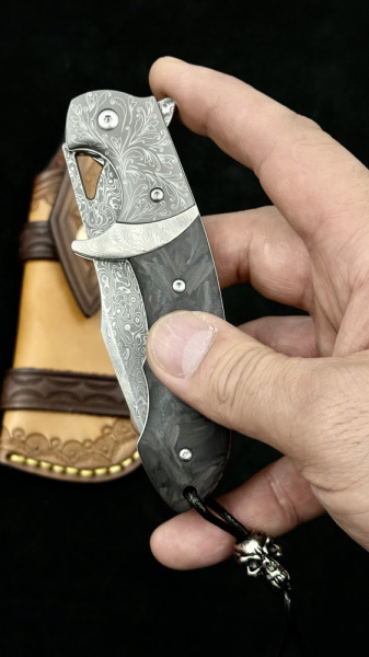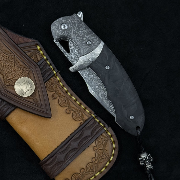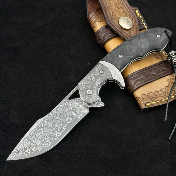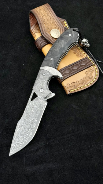 Най-висок клас масивен сгъваем нож от дамаска ТОП стомана и черно пустинно дърво. Висококачествено гравирано острие, дръжка и кания