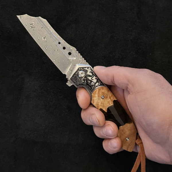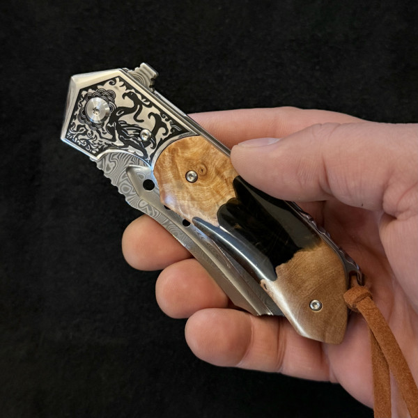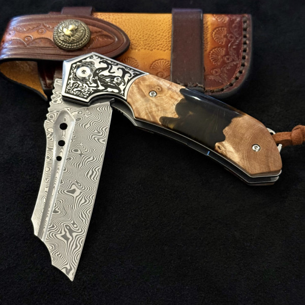 1149 Отзива за Полуавтоматичен сгъваем ТОП нож JAP SPIDER DAMASKUS МК-16 с палец за отваряне,стомана VG10 damask, дръжка маслина и смола, кожен кобур
