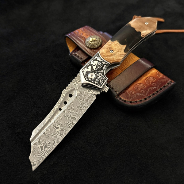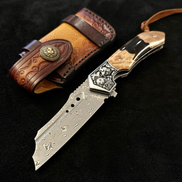 Полуавтоматичен сгъваем ТОП нож JAP SPIDER DAMASKUS МК-16 с палец за отваряне,стомана VG10 damask, дръжка маслина и смола, кожен кобур