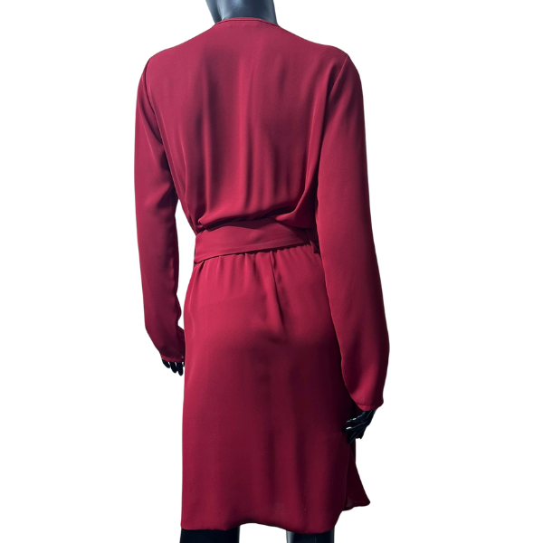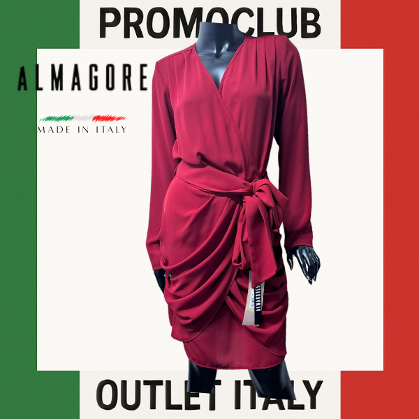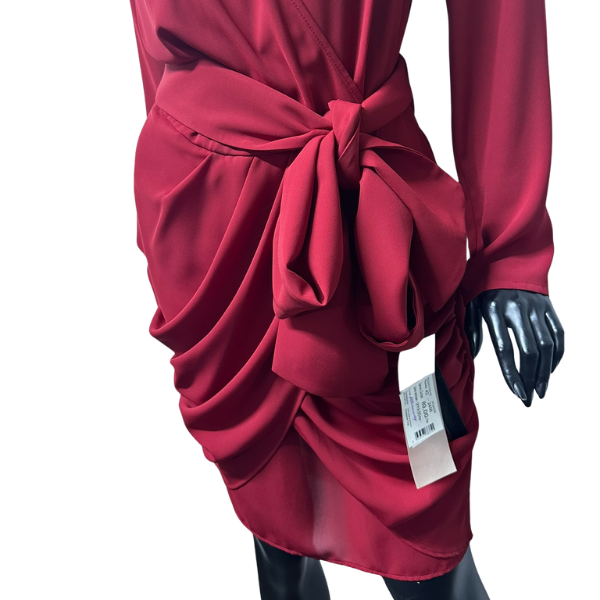 Моделът е с прехлупване отпред и дълъг ръкав, съчетаващ класическа изчистена линия с ефектни дизайнерски детайли. Вталяващият колан с голяма панделка подчертава талията, а драпировките в долната част създават женствен обем и изтънчен силует. Бордовият цвят „Rosso“ е изключително елегантен и подходящ както за официални поводи, така и за стилни вечерни излизания.