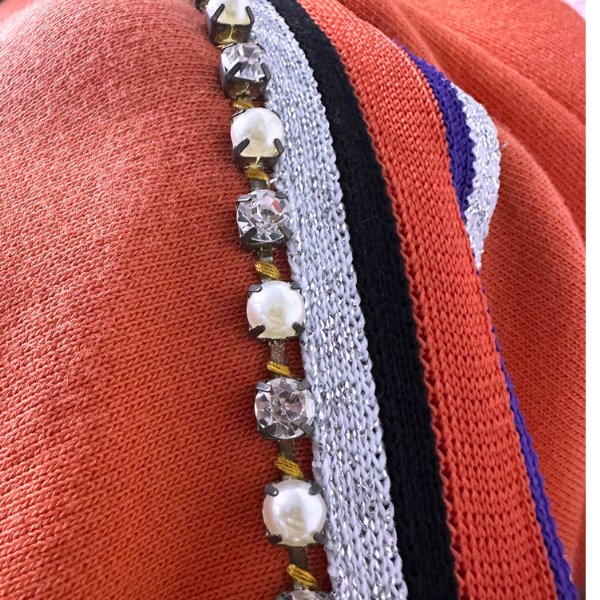 ➡️ Ръкавите са декорирани с апликация от кристали и перли върху цветни ленти, което придава изключителен характер и луксозен вид.