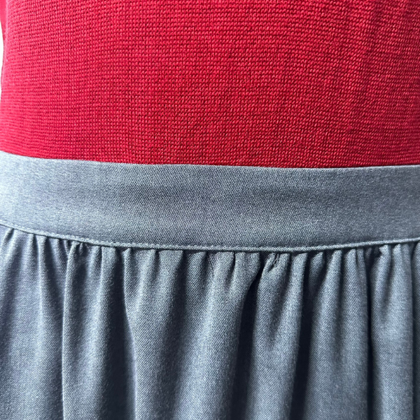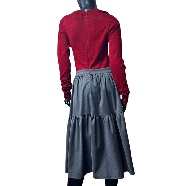 Моделът е с дълъг ръкав и класическо овално деколте, което подчертава семплата, но изискана линия. Полата пада свободно с обемни платки, създавайки женствен и комфортен силует. Роклята е подходяща както за ежедневието, така и за по-официални поводи, когато се комбинира с токчета или ботуши